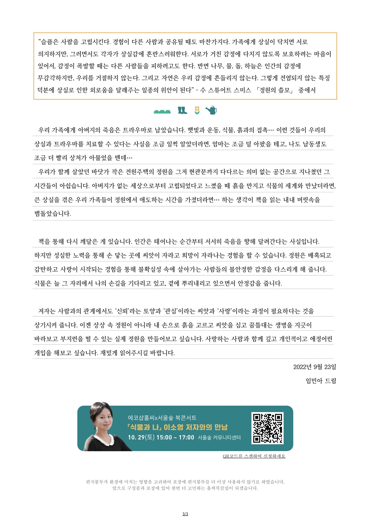 에코샵홀씨 활동가 뿌리한테 연락이 왔다. 8월 초였는데, 홀씨북클럽 구독자들과 함께 읽을 책을 선정해달라고 했다. 9월의 큐레이터로 편지글을 써달라는 요청이었다. 부담스럽다고 했지만, 뿌리는 물러설 생각이 없는 것 같았다. 여름휴가 다녀온 날 다시 연락이 왔다. 너무 자연스럽게 원고 마감 날짜를 물어보게 됐고, 그렇게 숙제의 압박이 밀려들어왔다.