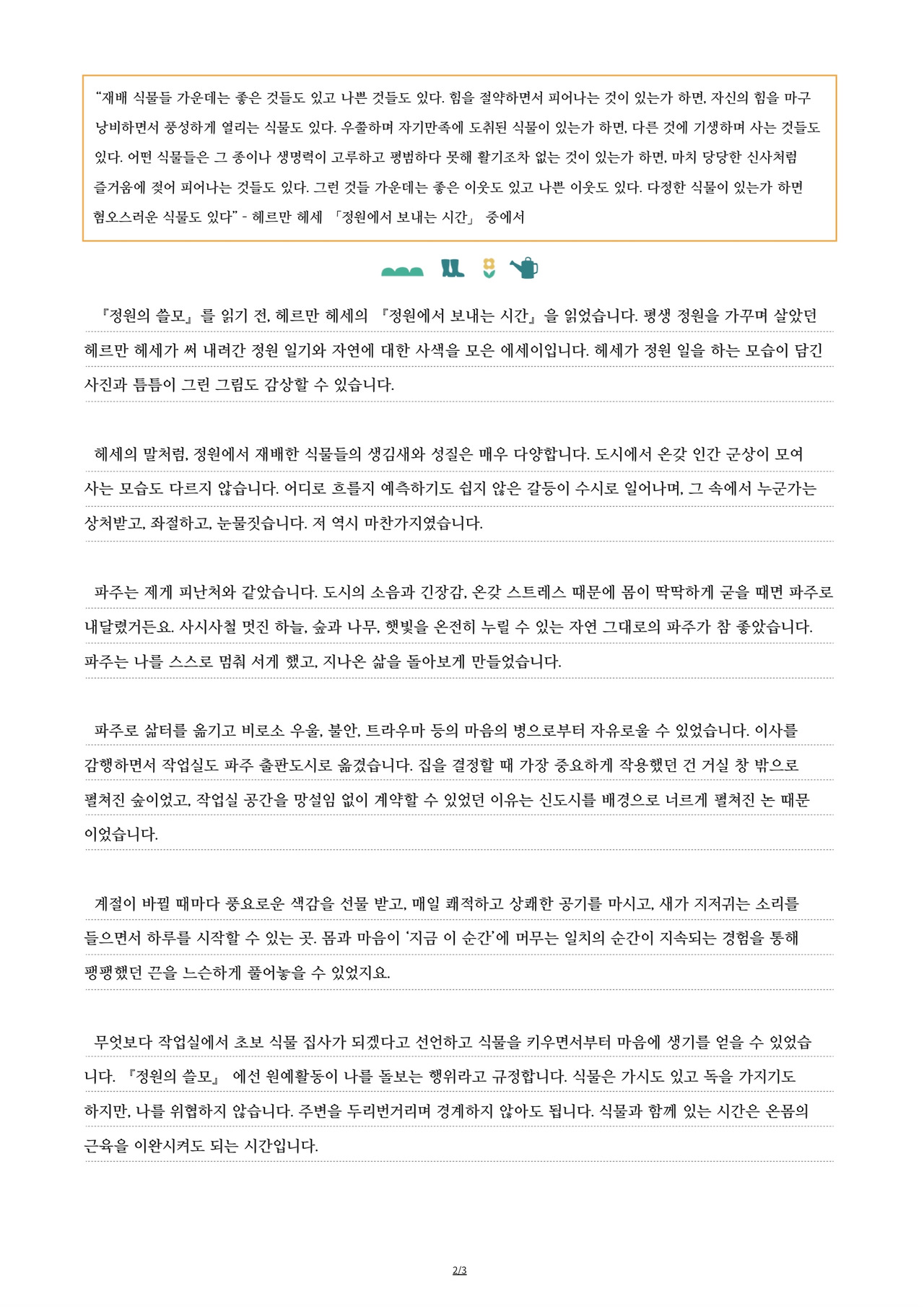 뿌리는 생태+인문 코드가 있는 책, 삶을 이야기할 수 있는 책을 선정해달라고 했다. 편하게 두 권 선택해서 추천사를 써주면 좋겠다고. 8월 22일부터 <정원의 쓸모>, <정원에서 보내는 시간> 두 권의 책을 읽기 시작했다. 내가 부담스럽다고 얘기한 게 떠올랐는지, 뿌리는 원고 마감 날짜를 추석 이후로 연장해줬다. 덕분에 추석 연휴를 책과 함께, 노트북 앞에서 보낼 수 있었다.