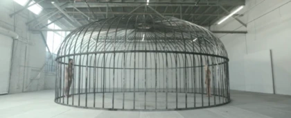 여자는 남자의 손을 잡고 새장 밖을 나오려 하는데