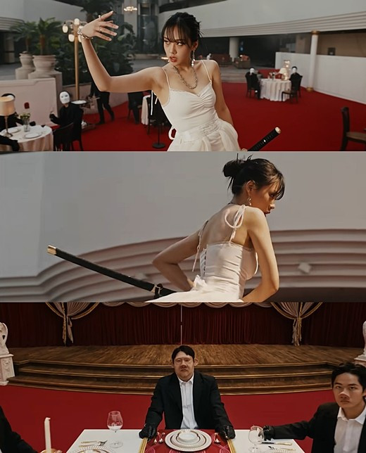 비비가 '킬빌'의 루시 리우처럼 칼을 들고 식탁을 뛰어가 두목으로 보이는 자의 목을 날리며 시작합니다. 그 후 비비는 '킬빌'의 우마서먼처럼 잔챙이들을 쓸어버리고, 피칠갑을 한 몸으로 일렉기타를 연주합니다.