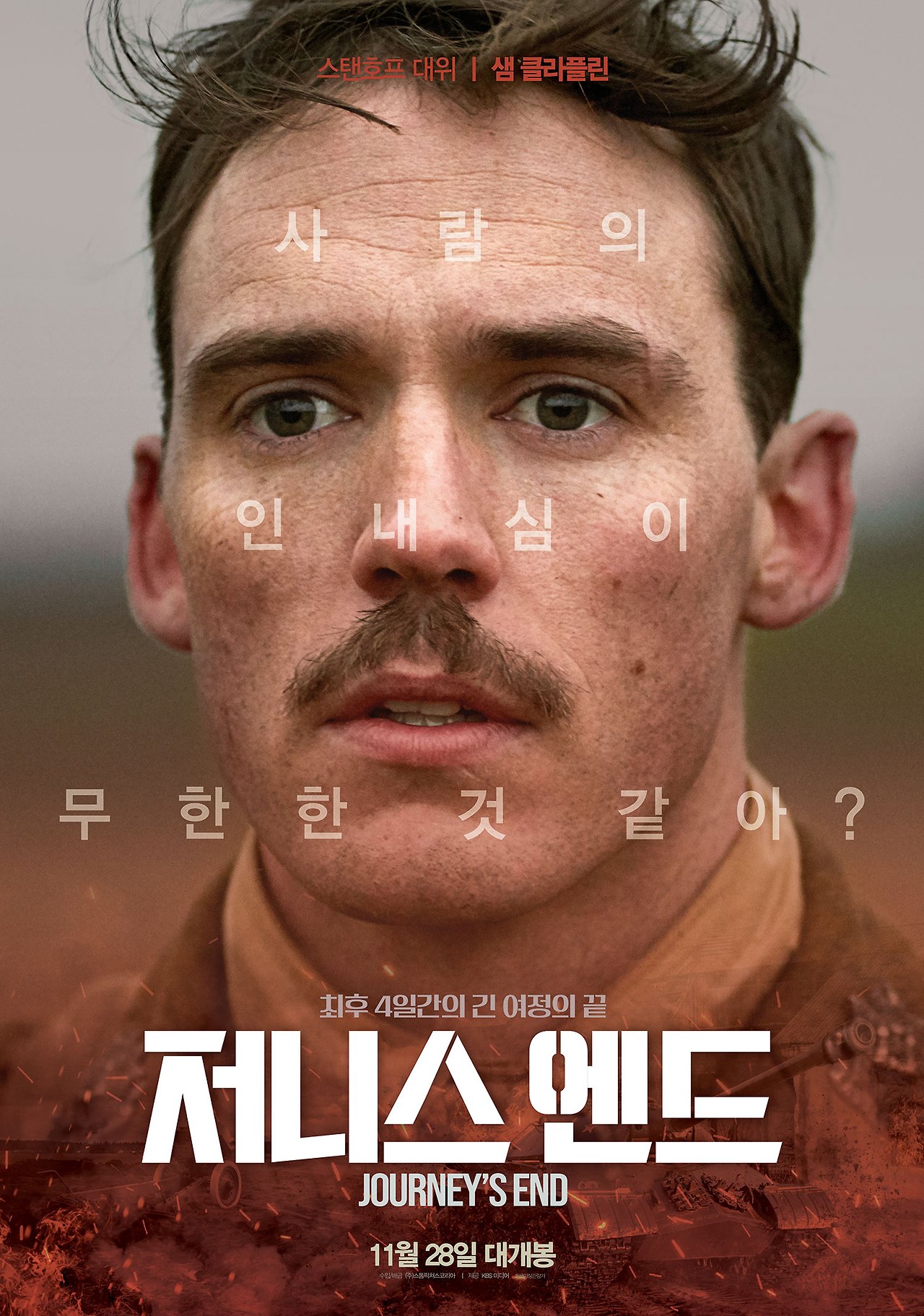 영화 <저니스 엔드>는 적이 언제 공격할 제 모르는 세계 1차 대전의 프랑스 최전선에서 6일의 시간 동안 지켰던 한 부대의 장교들을 중심으로 이야기를 전개한다. 한 부대가 6일 동안 전선을 지키고 다시 다른 부대와 교대하게 된다. 그런 교대 속에 투입되는 부대의 병사들은 어두운 얼굴을 하고 있고 철수하는 부대의 병사들은 홀가분한 얼굴로 빠르게 그곳을 빠져나간다. 영화는 병사들을 지휘하는 중대장 스탠호프(샘 크래플린)와 부중대장 오스본(폴 베타니)을 중심으로 새롭게 투입된 소대장 롤리(에이사 버터필드)의 표정을 보여주며 전장의 분위기를 전한다.