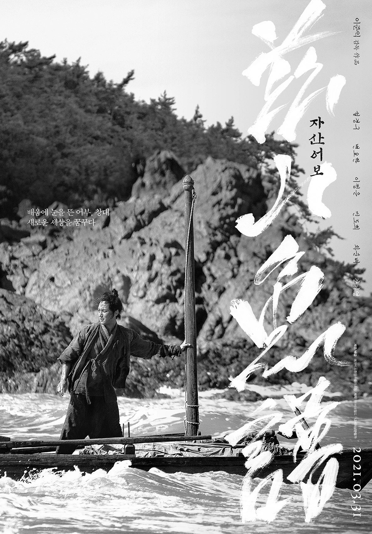 영화 <자산어보>는 정약전이 유배시절 쓴 자산어보의 서문에 적힌 내용을 바탕으로 상상을 가미해 구성한 영화다. 서문에 등장하는 창대는 물고기에 대하여 박학다식하다고 적혀있고 자산어보를 완성하는데 많은 도움을 준 것으로 나타난다. 하지만 이 둘이 실제로 스승과 제자 관계였는지 그리고 각자 어떤 길을 가게 되었는지는 상상의 영역이다. 흑백으로 촬영된 이 영화는 흑산도(黑山島)의 모습을 아주 정갈하고 깨끗하게 담는다. 마치 그 당시의 이야기를 보는 것처럼 영화에는 흑과 백으로 구성되어 빛바랜 앨범을 꺼내어 보는 듯한 느낌을 준다. 흑백으로 촬영되었음에도 불구하고 영화가 비추는 흑산도 주변의 모습이나 고기를 손질하는 모습을 비추는 카메라는 생동감과 에너지가 넘친다.