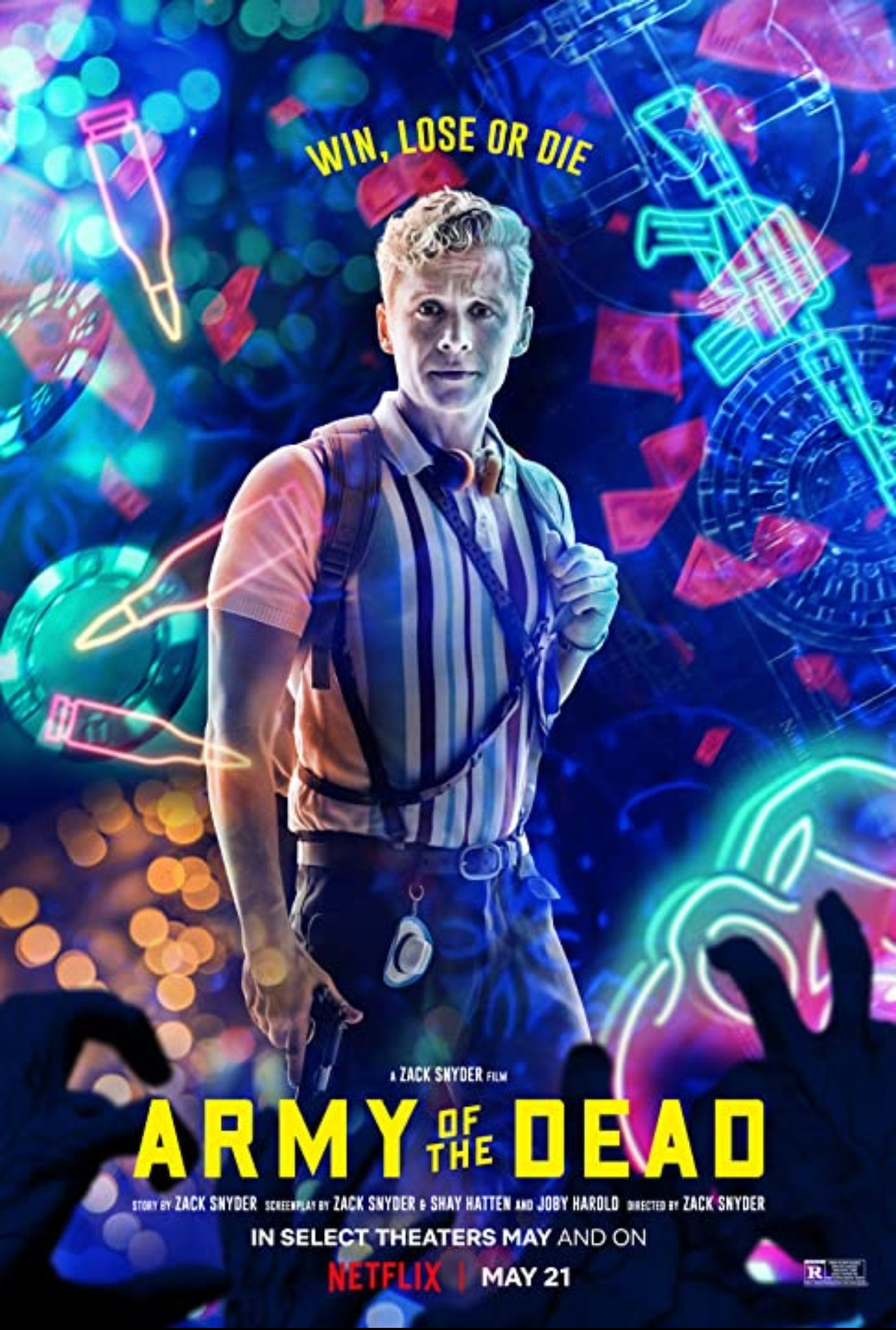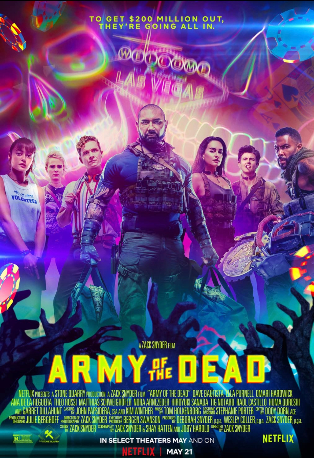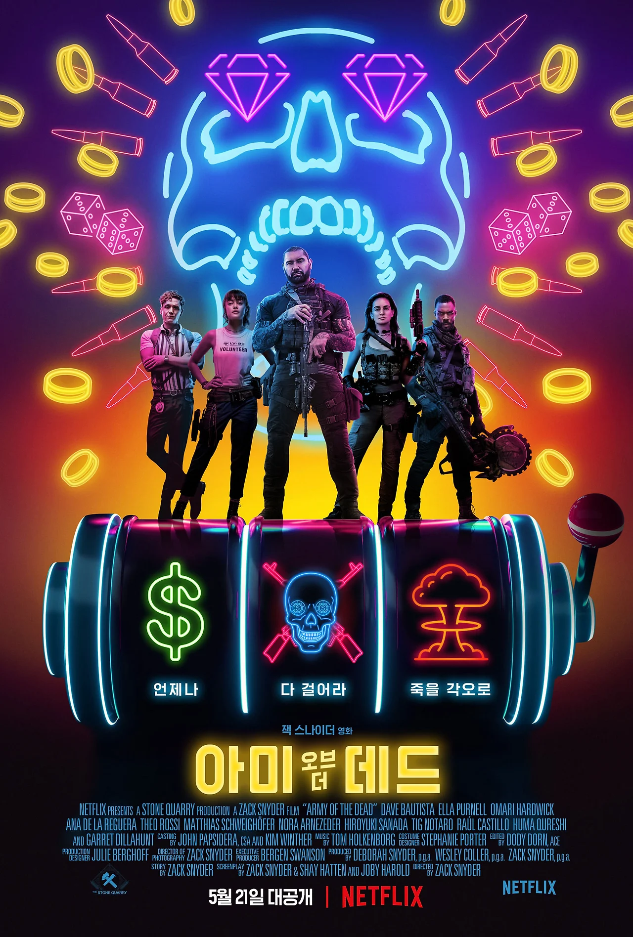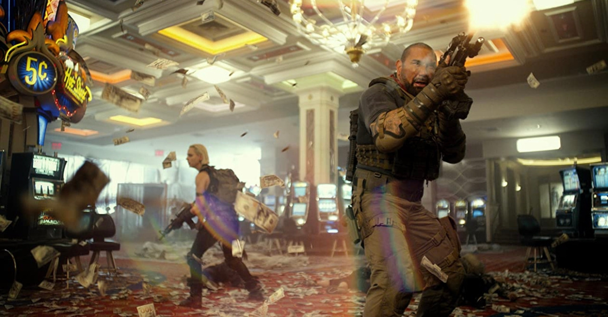 사실 <새벽의 저주>의 스피디함과 박진감을 기대했다면 대부분 실망할 것이다. 최근에 나온 <부산행>, <반도>, <월드워 Z> 같은 영화들과 색깔이 다른 좀비 영화라고 할 수 있다. 이 영화는 속도감이 별로 없다. 그리고 잭 스나이더가 좋아하는 슬로우 모션도 거의 등장하지 않는다. 스콧(데이브 바티스타)이 팀을 조직하여 좀비 격리 구역인 라스베가스의 금고에서 돈을 가지고 오는 것이 내용인데, 팀을 조직하고 들어가는 데까지 꽤 많은 시간을 할애하고 있다. 후반부 액션에서도 크게 속도감이 증가하지 않는다.