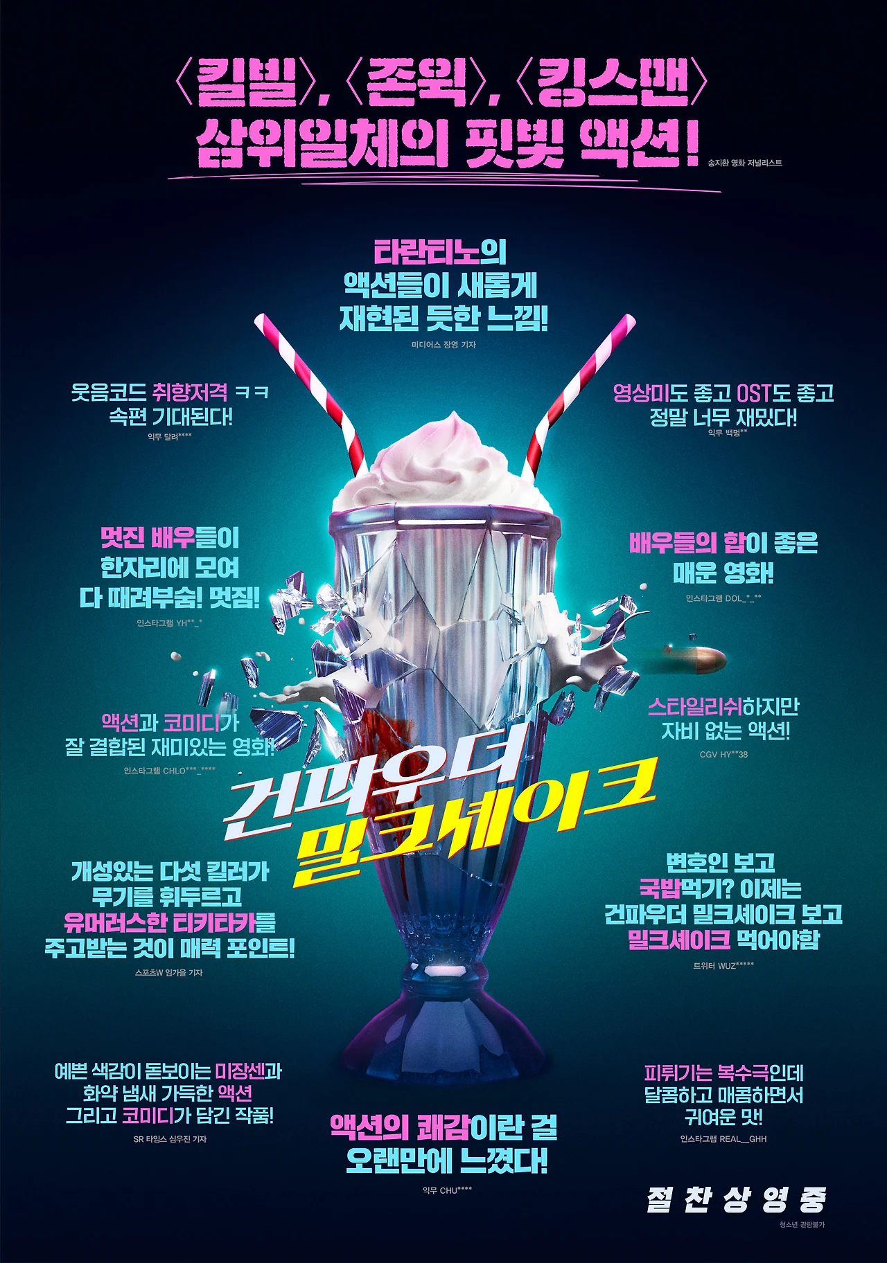 영화의 전반적인 등장인물과 구성을 보면 영화 <존 윅> 시리즈가 떠오른다. <존 윅>에서 킬러들이 도움을 받는 호텔은 이 영화에서 도서관이 되고, 킬러들에게 임무를 주고 대가를 주는 회사도 일맥상통하는 부분이 있다. 하지만 <존 윅>은 개인과 시스템의 대결이 좀 더 강조된다면, <건파우더 밀크셰이크>는 시스템에 반기를 든 작은 조직이 대결을 한다는 점에서 약간의 차이가 있다. 또한 <존 윅>에는 꽤 유능한 킬러들이 존 윅을 죽이기 위해 대결을 자처했다. 하지만 <건파우더 밀크셰이크>의 조직에서는 그런 유능한 킬러가 등장하지 않는다. 어찌 보면 위기를 맞은 시스템을 지켜줄 유능한 존재가 없었다고 볼 수 있다. 샘과 친구들을 제거하려 하는 건 시스템의 인물이 아니라 시스템의 경쟁 조직을 이끄는 인물이다. 이런 무능한 시스템은 영화의 전반적인 긴장감을 떨어뜨리는 요소로 작용하기도 한다.