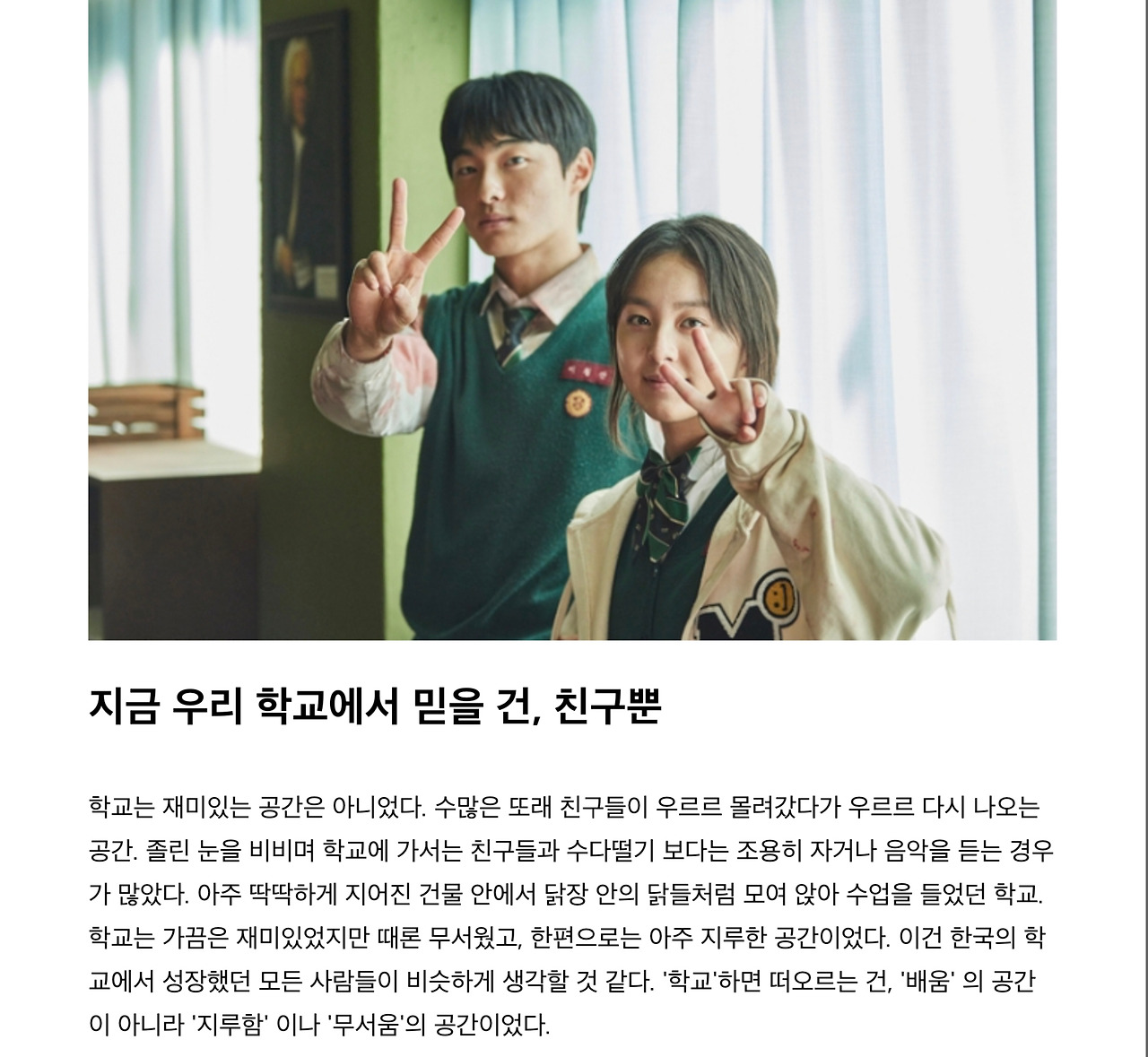 넷플릭스 드라마 <지금 우리 학교는>에서도 눈에 들어오는 건 친구들과의 관계였어요. 세상은 지옥으로 변했고, 어른들은 도움을 주기 어렵습니다.