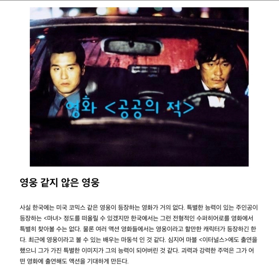 단순히 액션 영화를 보기 위해 만들어진 영화가 아닌 그 캐릭터의 고민과 감정이 관객에게도 잘 전달되는 히어로 영화들이 좀 더 좋은 평가를 받는 것 같아요. 더 좋은 영화이기도 하구요,