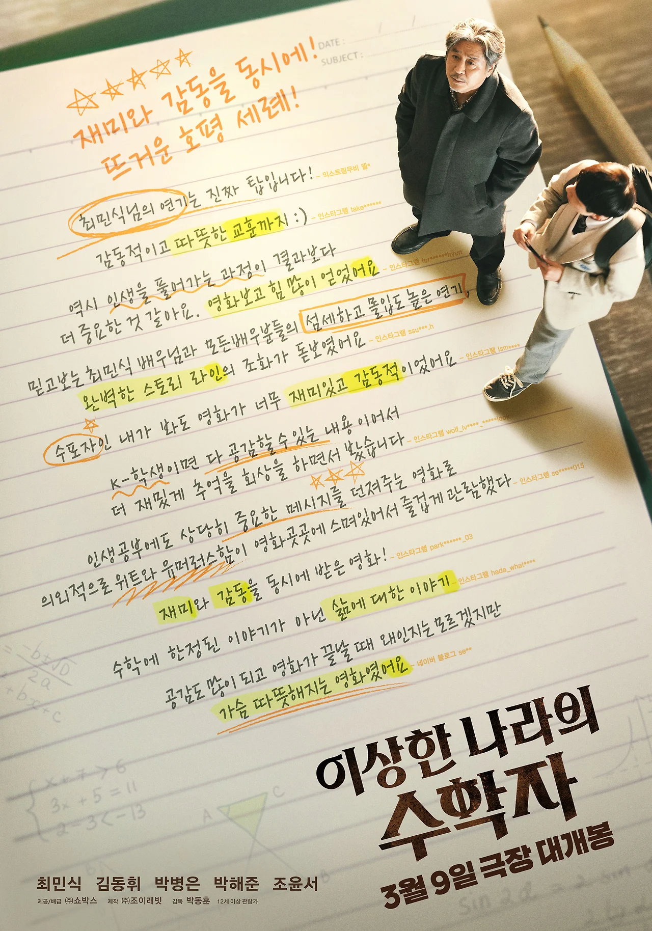현대사회에서는 결국 결과가 많은 것을 결정한다. 그것 자체를 피할 수는 없다. 하지만 그것 못지않게 과정 역시 중요하다. 좋은 과정이 생략된 결과는 오래가지 못하고 머릿속에 남지 않고 증발되어 버린다. 영화 속 지우는 학성의 의도에 맞게 과정에서 얻을 수 있는 ‘재미’와 ‘희열’을 느낀다. 조금 느리지만 그가 원하는 시험 결과도 얻어낸다. 그 이후 그 학생과 시스템을 유지시키는 건, 결국 어른들의 몫이다. 영화는 다소 극적으로 구성되어 있지만, ‘수학’이라는 과목의 특성을 잘 활용하여 보는 관객들에게 과정이 그만큼 중요하다는 것을 다시 한번 이야기하고 있다. 우리 모두가 이미 알고 있는 사실이지만 현실에서 쉽게 잊어버리게 되는 그 사실이 영화를 보는 내내 다시 전달된다. 무엇보다 그 모든 전달 과정이 지우와 학성의 따뜻한 관계를 통해 전달되고 있어, 영화를 다 보고 난 관객들은 기분 좋은 마음으로 극장을 나설 수 있을 것 같다.