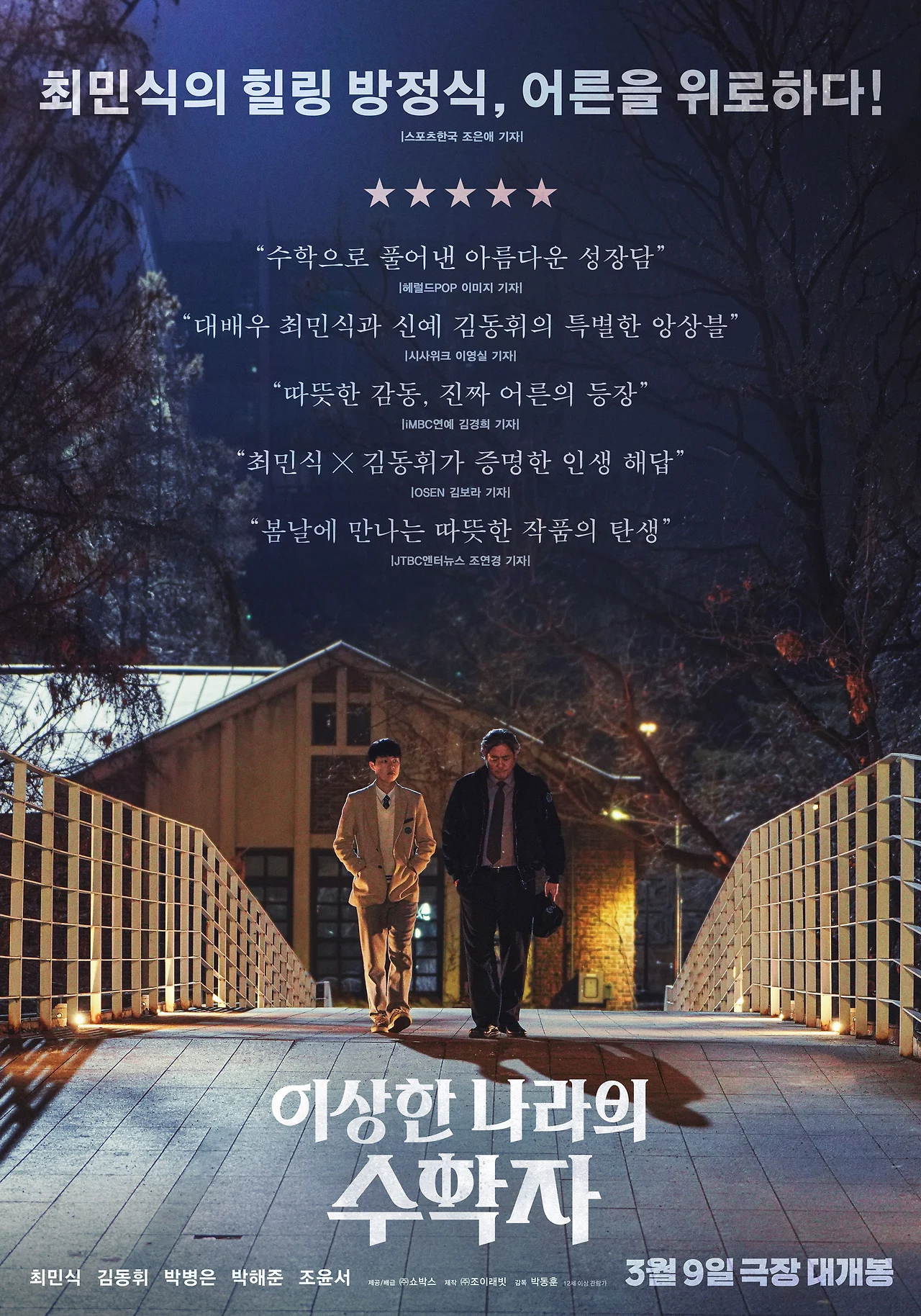 학성 역을 맡은 배우 최민식은 <천문:하늘에 묻는다> 이후 오랜만에 좋은 연기를 보여준다. 힘을 뺀 연기로 부드러운 목소리를 들려주며 과거의 회한과 후회를 안고 살아가는 탈북 수학자의 모습을 보여주고 있다. 지우 역을 맡은 배우 김동휘는 <탐정 홍길동:사라진 마을>과 <피터팬의 꿈> 같은 영화들에서 인상적인 연기를 보여준 적이 있다. 이번 <이상한 나라의 수학자>에서는 자신이 피해를 입더라도 자신의 목소리를 밖으로 내지 않고 힘든 일을 안고 가려는 조금은 소심하고 체념적인 지우를 잘 표현해냈다.
