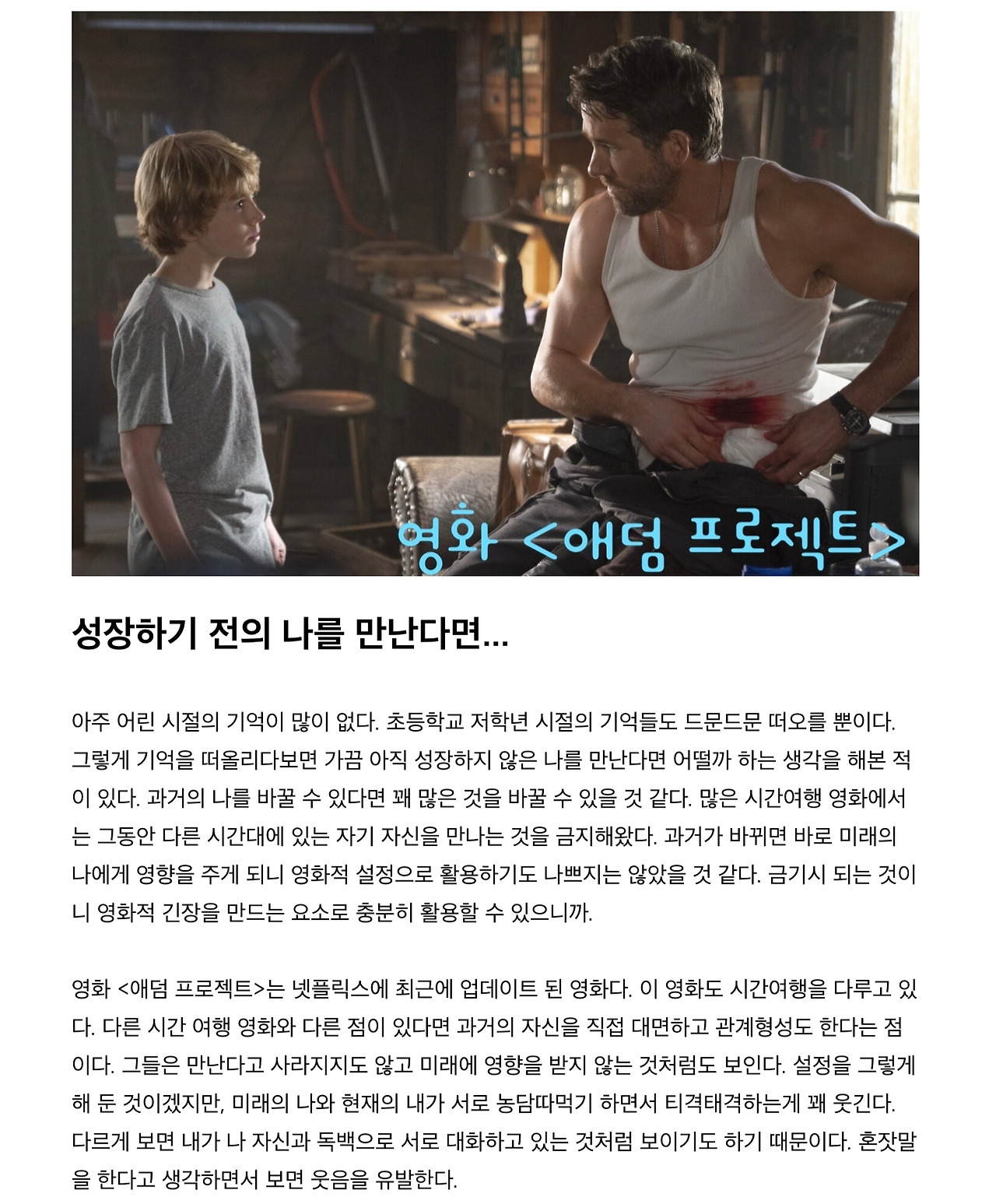 <애덤 프로젝트>는 타임머신 영화인데요. 미래의 내가 과거의 나를 만나면서 벌어지는 일을 담고 있어요.