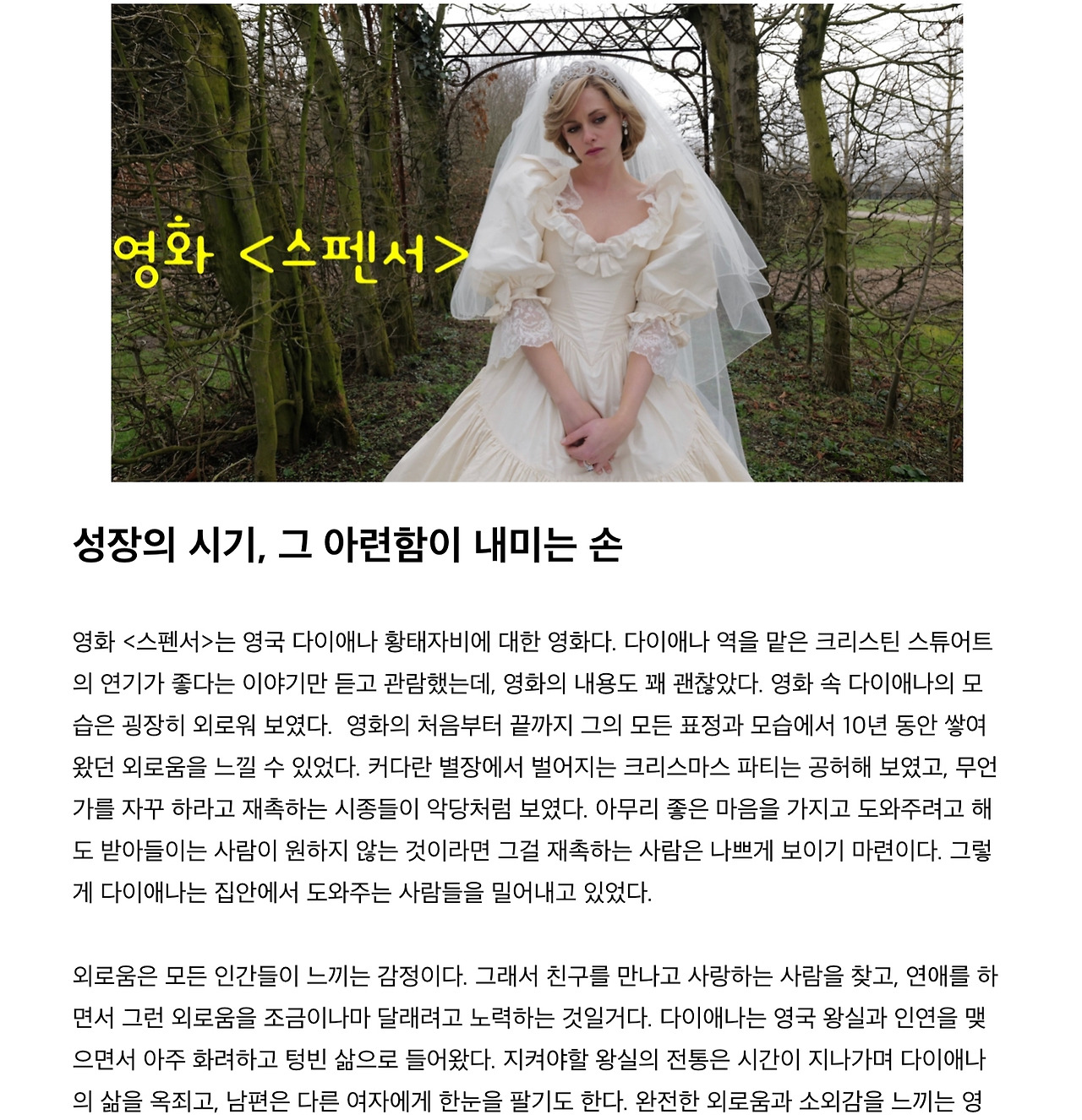 <스펜서>는 영국 다이애나 황태자비의 이야기예요. 실제 있었던 일이라기보단 그녀가 가지고 있던 감정을 표현한 영화라는 표현이 적절하겠네요.