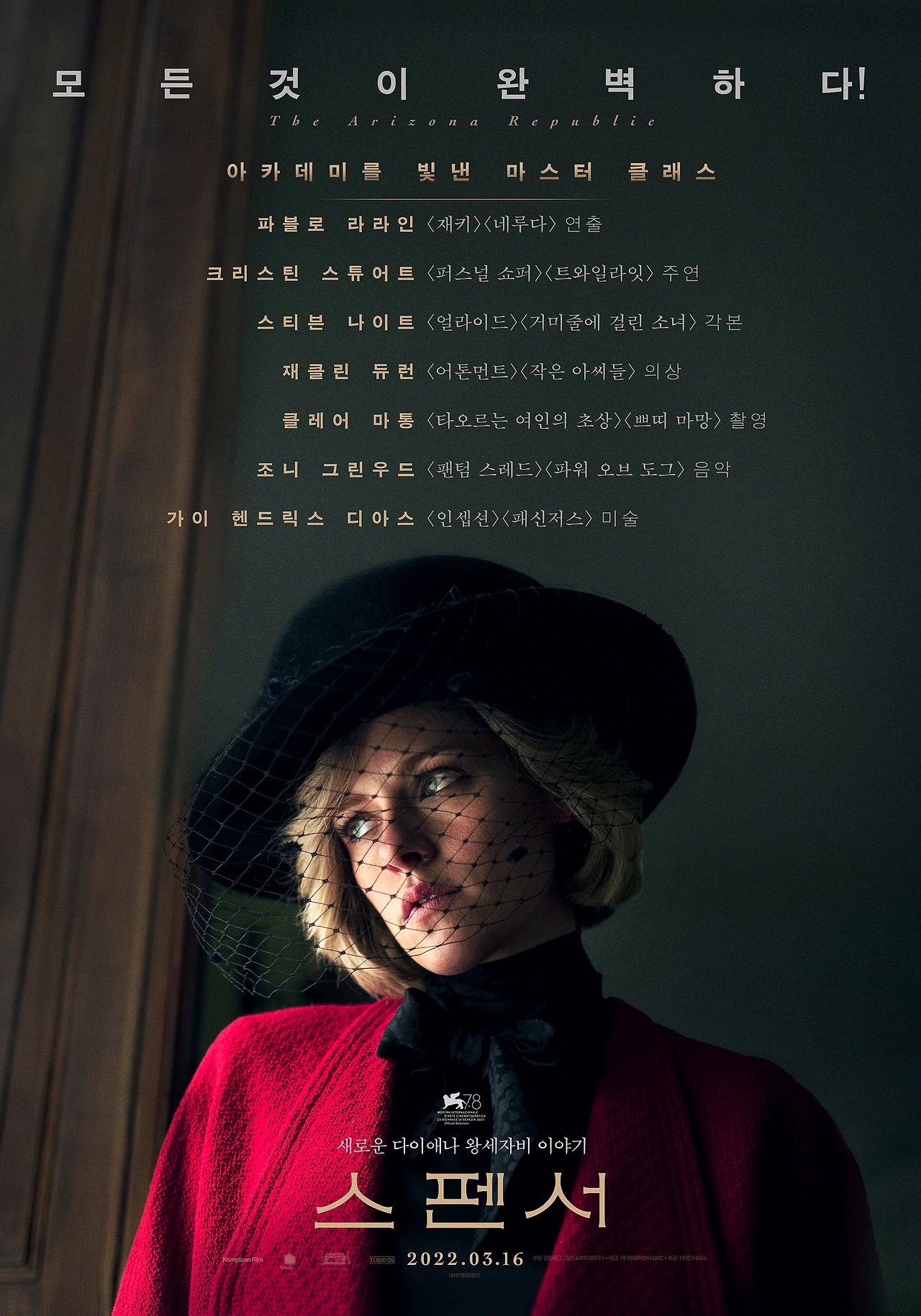 영화를 연출한 파블로 라라인 감독은 과거에도 퍼스트레이디인 재클린 케네디의 이야기를 다룬 <재키>나 칠레의 민중 영웅 파블로 네루다의 이야기를 다룬 <네루다>를 연출한 경험에 있다. 이번 <스펜서>에서도 실존인물인 다이애나 황태자비가 가졌던 감정을 두 시간의 영상으로 함축하여 효과적으로 전달하고 있다.