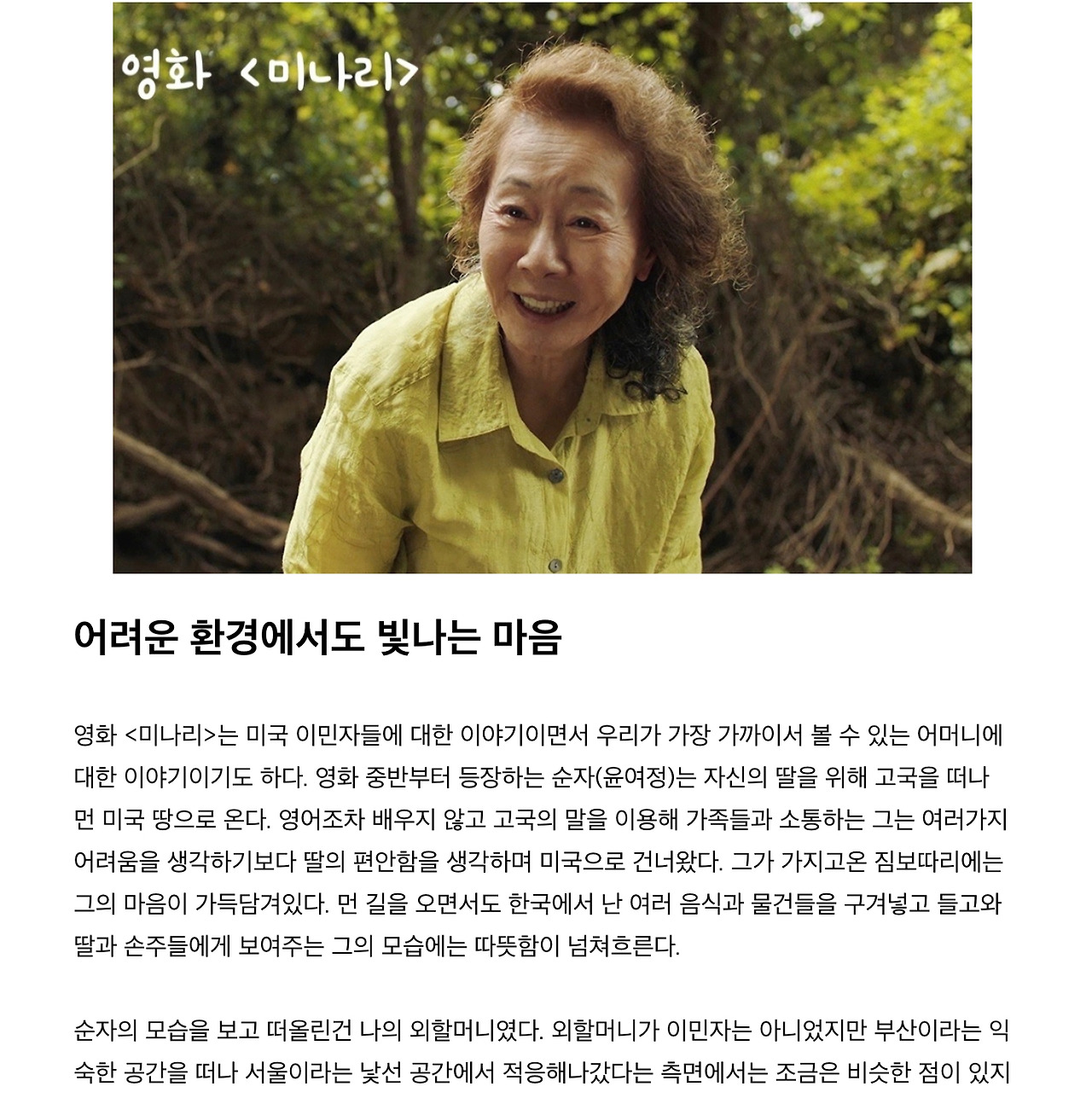그렇게 이어져 영화 <미나리>의 외할머니 순자까지 생각이 이어졌어요.