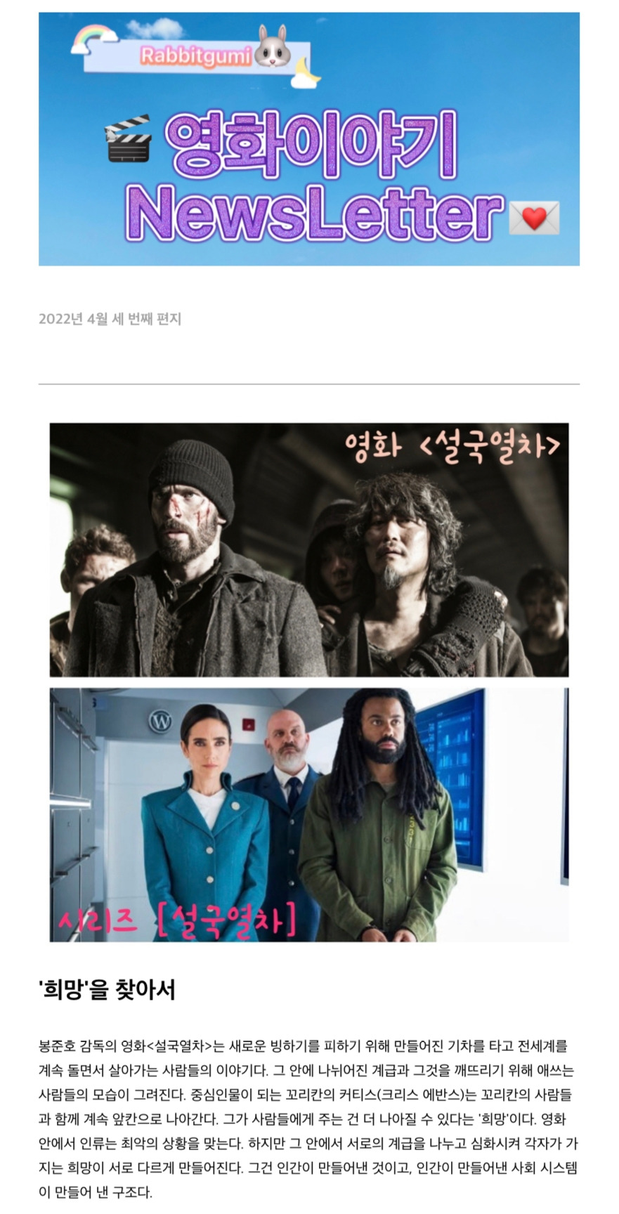 그리고 열차 안의 삶보다는 제3의 삶을 택하는 주인공의 모습이 눈에 들어와 그런 내용들을 정리해보았어요.