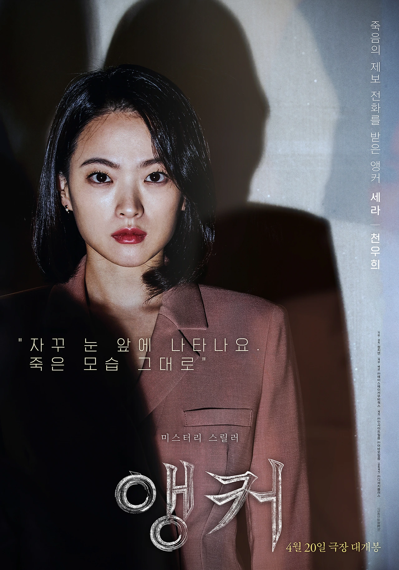 영화 <앵커>는 방송사의 간판 앵커로 자리 잡은 세라(천우희)의 이야기를 담고 있다. 그는 방송사 9시 뉴스를 진행하고 있는 간판 앵커다. 어느 날 자신에게 온 전화 제보를 받게 되고 관련한 취재를 하던 중 제보자와 그의 딸이 죽어있는 것을 발견한다. 그 사건을 통해 만나게 되는 정신과 의사 인호(신하균)를 만나게 되고 이상한 점을 느낀 세라는 계속 그 사건에 매달리며 이상한 환영을 보게 된다. 세라의 주변에는 엄마 소정(이혜영)이 있고 소정은 늘 세라에게 잔소리를 한다. 세라가 제보자의 사건을 추적하는 과정에서 소정과의 관계는 계속 악화되어 버린다.