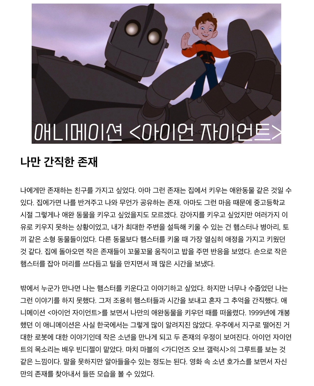 <아이언 자이언트>를 보면서 청소년 시절 기르던 애완동물이 떠올랐어요. 지금 딸과 함께 기르고 있는 강아지도 떠올랐죠.