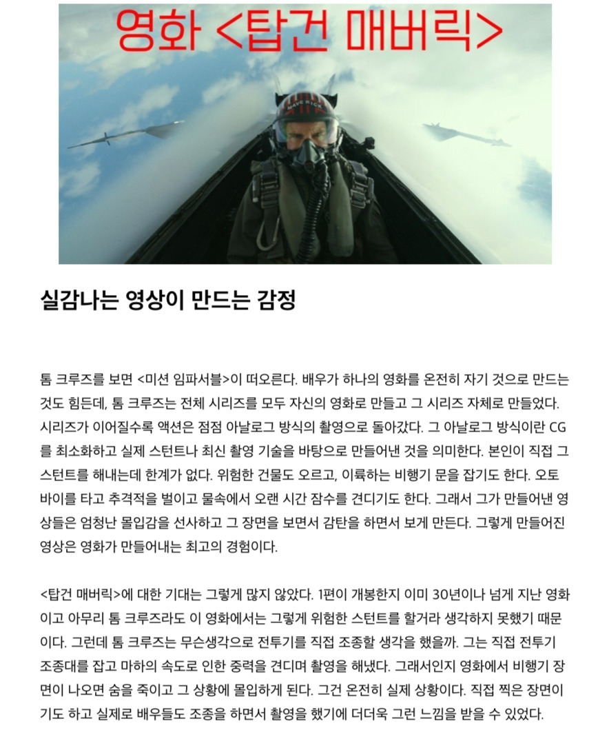영화 <탑건 매버릭>을 보고는 영화가 주는 현실감에 압도되었어요.