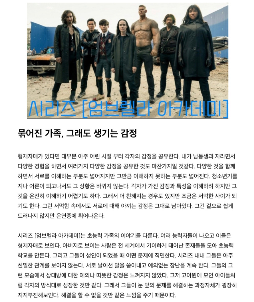 시리즈 [엄브렐라 아카데미]에서는 서로 아무 감정없이 비난하는 인물들의 모습이 눈에 들어왔어요.