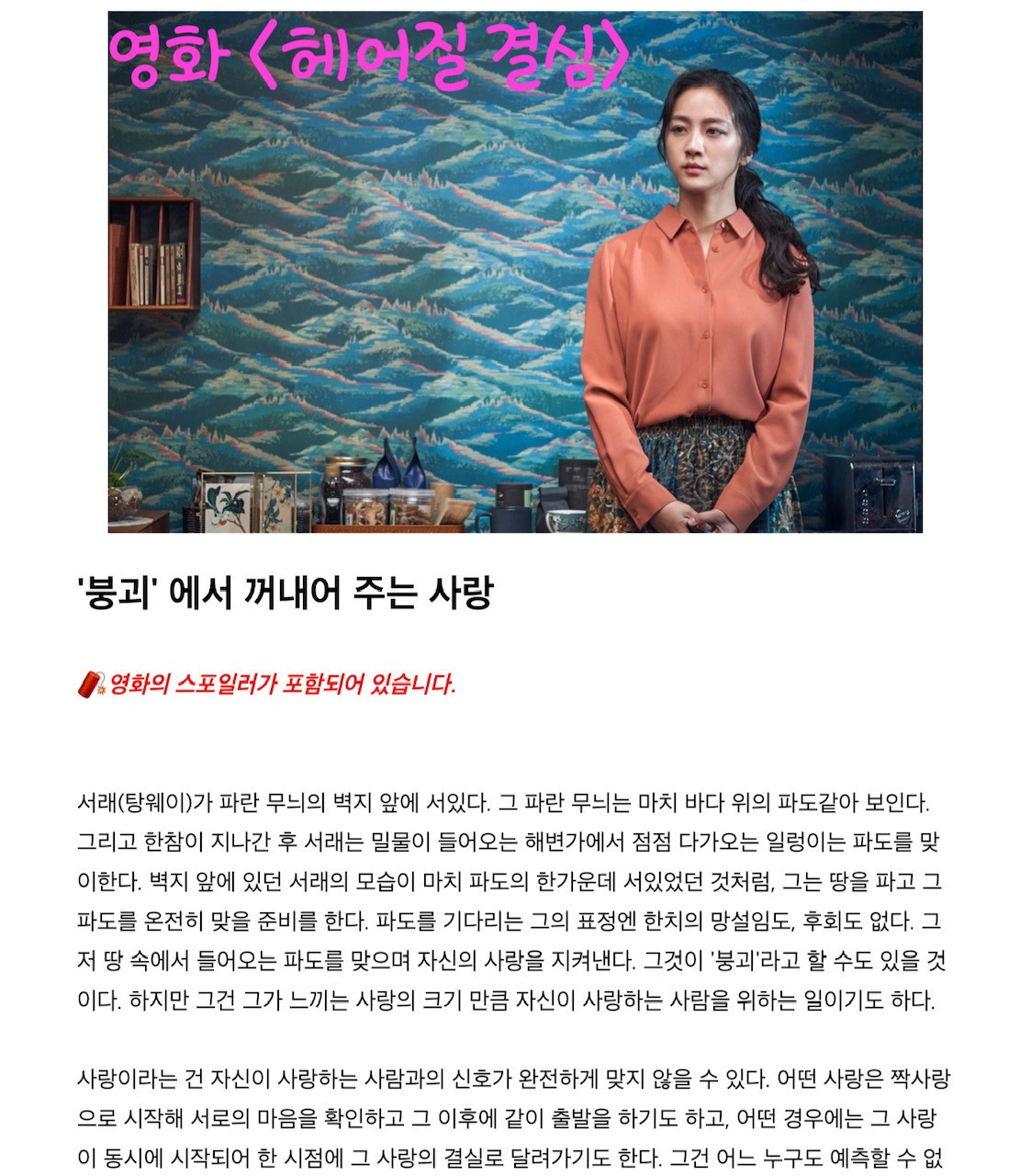 영화 <헤어질 결심>은 아름다운 사랑 영화다. 박찬욱 감독의 전작들에 비해 선정적이거나 폭력적인 장면은 줄었다. 대신에 천천히 두 인물이 가지게 되는 사랑의 감정을 담아낸다. 그들이 엇갈리는 과정과 느끼는 감정이 아름다운 화면에 표현되면서 과거 박찬욱 감독의 영화들에 비해서는 조금은 더 이해하기 쉬운 영화로 보인다. 스릴러의 외피를 두르고 있지만 이 영화는 두 인물의 사랑에 대한 영화이다. 무엇보다 이들이 겪는 사랑이라는 감정의 시차가 무척 아름답게 그려져 있는 영화다.