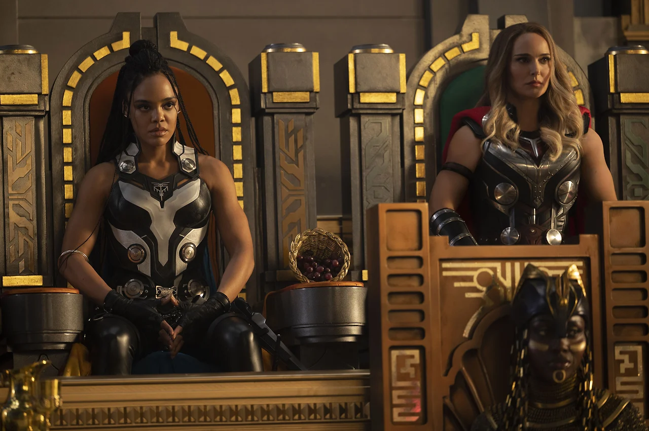 앞서도 이야기한 것처럼 빌런 고르는 단지 제인과 토르를 만나게 하는 기능적인 역할로 보인다. 마블에서 만들어가고 있는 전체 마블 유니버스 안에서 봐도 고르의 역할은 매우 한정적으로만 소비된다는 인상이 강하다. 그렇게 빌런을 소비하면서 영화는 마이티 토르가 된 제인과 토르가 만나면서 벌이는 로맨스에 좀 더 집중한다. 전작인 <토르 라그나로크>에서 보여줬던 재치와 유머들이 여전히 이번 영화에도 포함되어 있다. 토르의 우스꽝스러운 말투와 슬랩스틱 코미디 같은 행동은 제인과의 재회 순간에 활용되며 독특한 웃음을 선사한다. 또한 두 토르가 같이 전투를 벌이면서 서로 도와주는 장면은 꽤 완벽해 보인다.