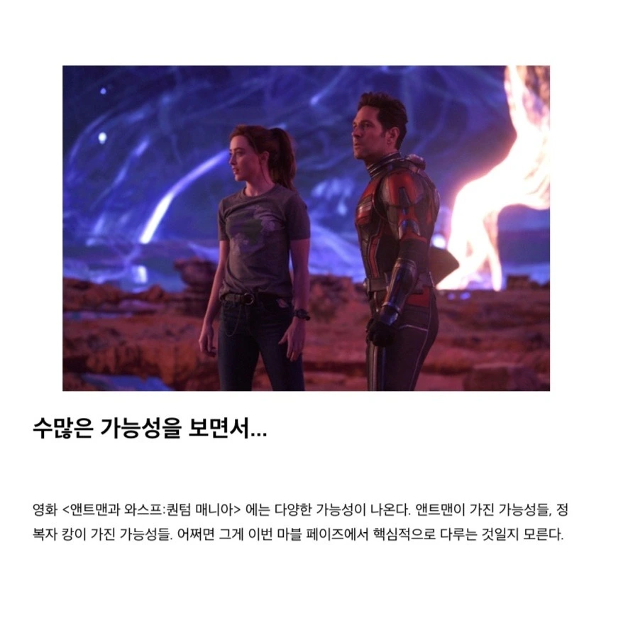 이번 주에 개봉한 영화 <앤트맨과 와스프: 퀀텀 마니아>는 앤트맨 고유의 색깔을 가진 마블 영화죠. 새로운 악당 정복자 캉을 보면서 저는 가능성을 대하는 태도가 앤트맨과 다르다고 느꼈어요.