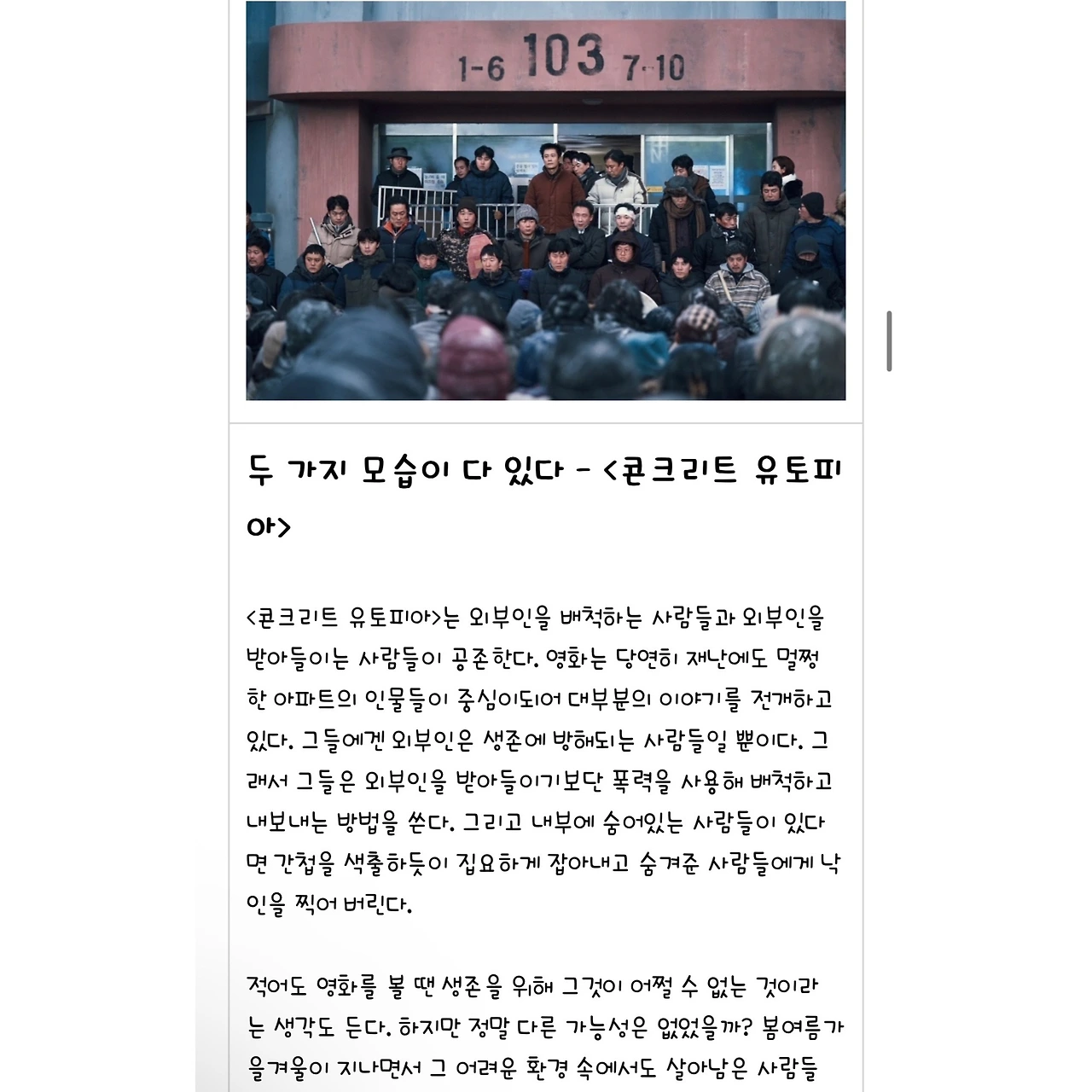 <콘크리트 유토피아>에는 외부인을 배척하는 사람들이 나오지만, 반대로 외부인에게 삶의 기회를 주는 사람들도 나오죠.