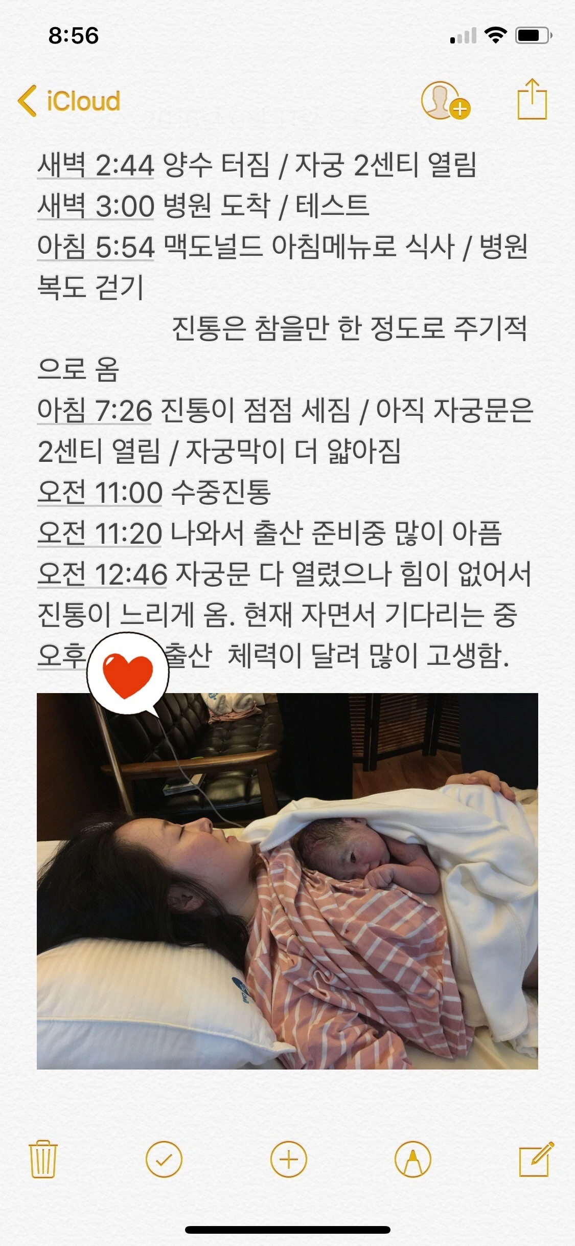 그렇게 새나가 우리와 만나게 되었다. 그때 장모님과 처남, 우리 부모님은 모두 처음 새나에게 인사를 했다. 장모님도 우리 어머니도 눈물을 보이셨고, 건강히 무사히 모든 과정이 끝난 걸 감사했다. 나는 그날 첫 양수가 터졌을 때 부터 아기가 나오는 그 순간까지를 아래 처럼 간략히 메모해 두었다. 그리고 아내와 새나의 첫 모습도 사진으로 담아두었다. 그 힘들었던 순간 순간이 아직도 눈에 선하다. 이렇게 각 시간대 별로 적어놓은 것을 보니 그 날의 모습이 하나하나 떠오르는 것 같다. 아내가 그렇게 고생한 것을 잊지 못할 것 같다. 너무나 안쓰러웠다. 그렇게 분만 과정이 끝나고 우리는 새로운 도전에 직면했다. 그날 부터 우리는 모자동실에서 육아를 처음 경험했다.