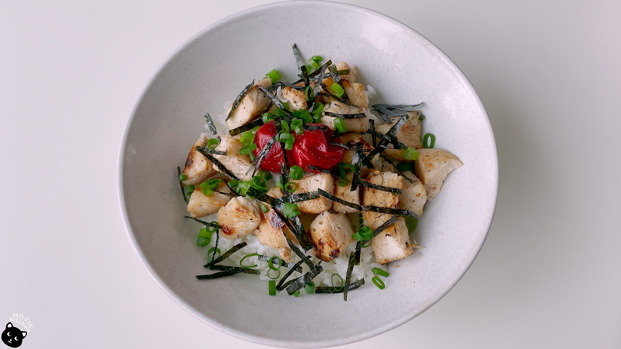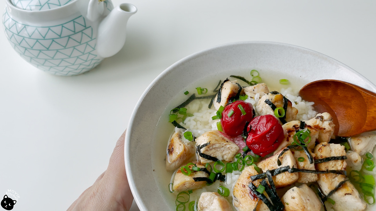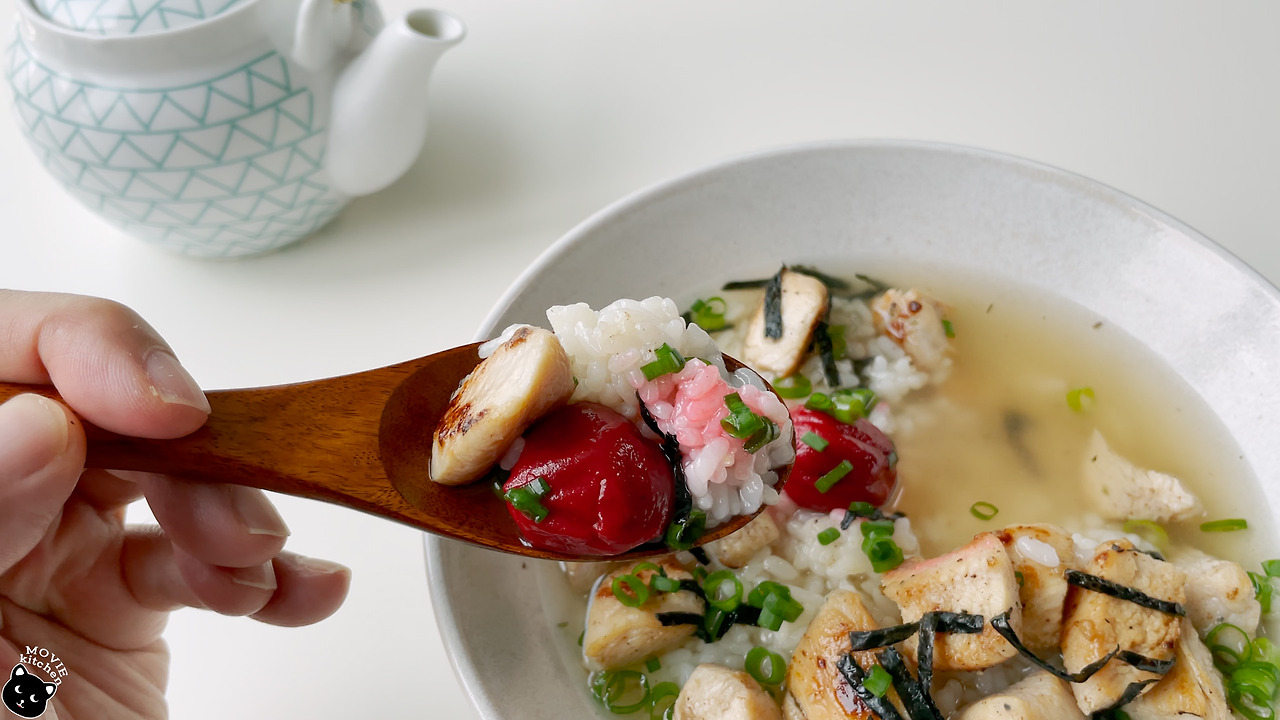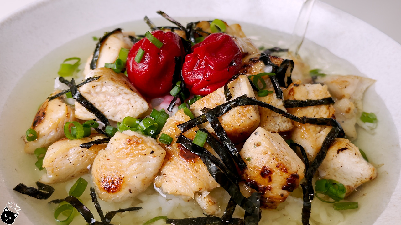- 그릇에 쌀밥, 구운 닭고기, 우메보시, 잘게 자른 김, 송송 썬 쪽파를 올리고 녹차 육수를 부어준다.