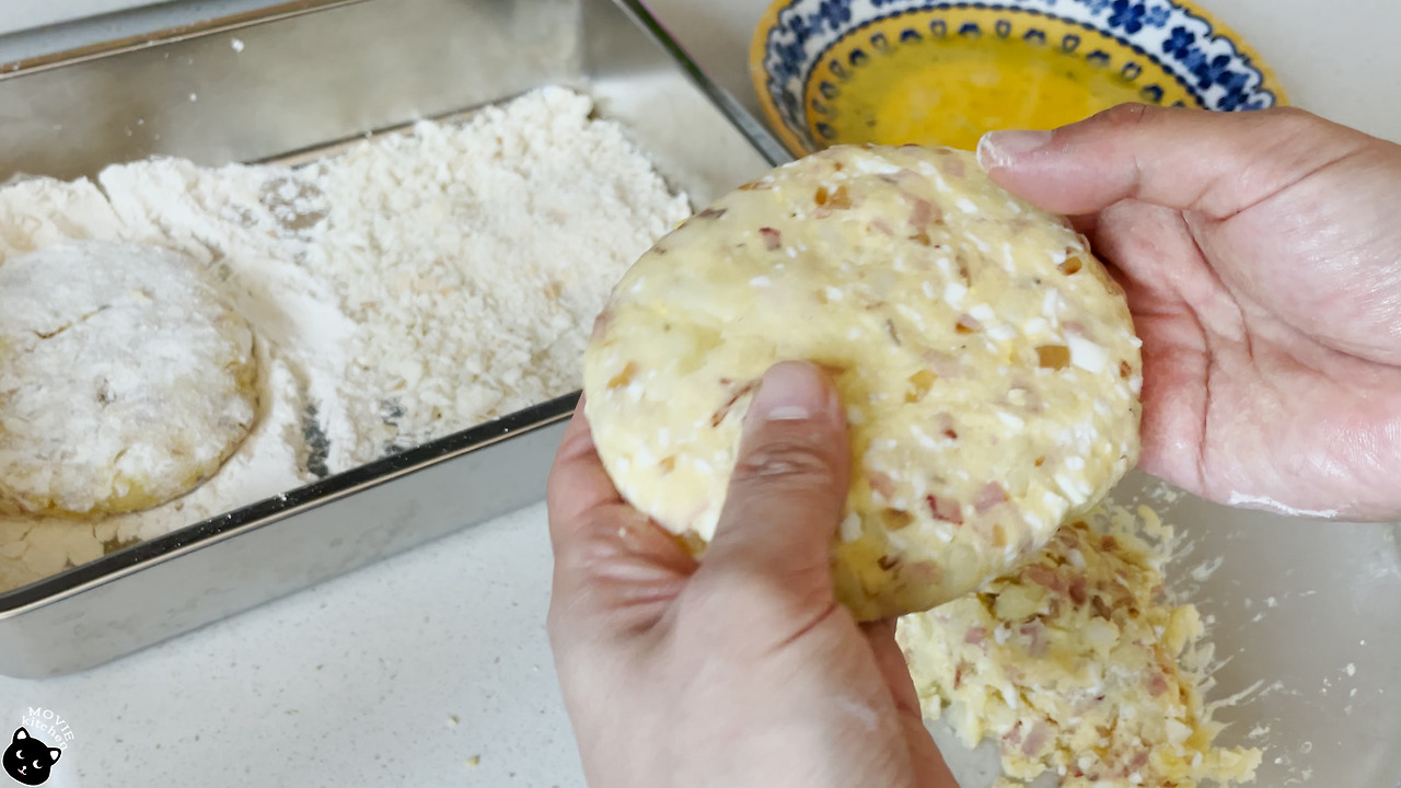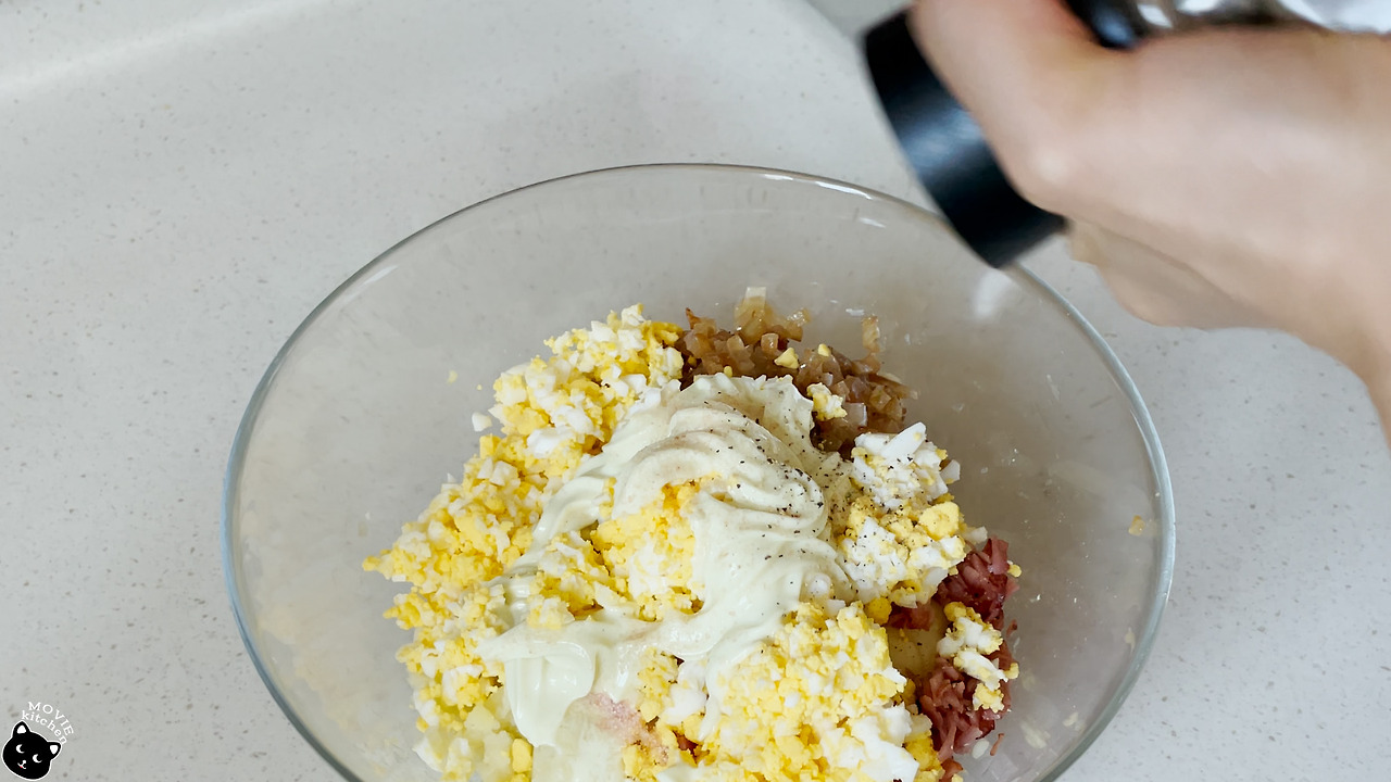 - (으깬) 삶은 감자, (다진) 볶은 햄, (다진) 볶은 양파, (다진) 삶은 계란, 마요네즈, 소금, 후추를 잘 섞어준다.