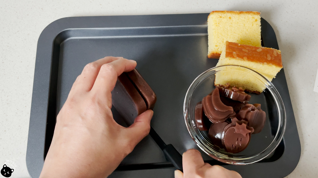 원래 시베리아는 카스텔라 위에 굳히기 전의 팥양갱을 붓고 그 위를 카스텔라로 덮어서 굳혀야 하지만 애니메이션처럼 똑 떨어지는 모양으로 만들어 보고 싶기도 했고 먹어보고 싶은 카스텔라도 있고 해서 양갱만 따로 만들어봤다.