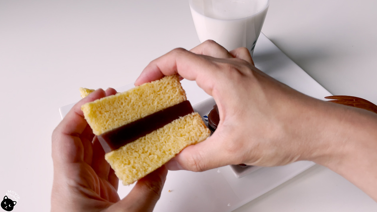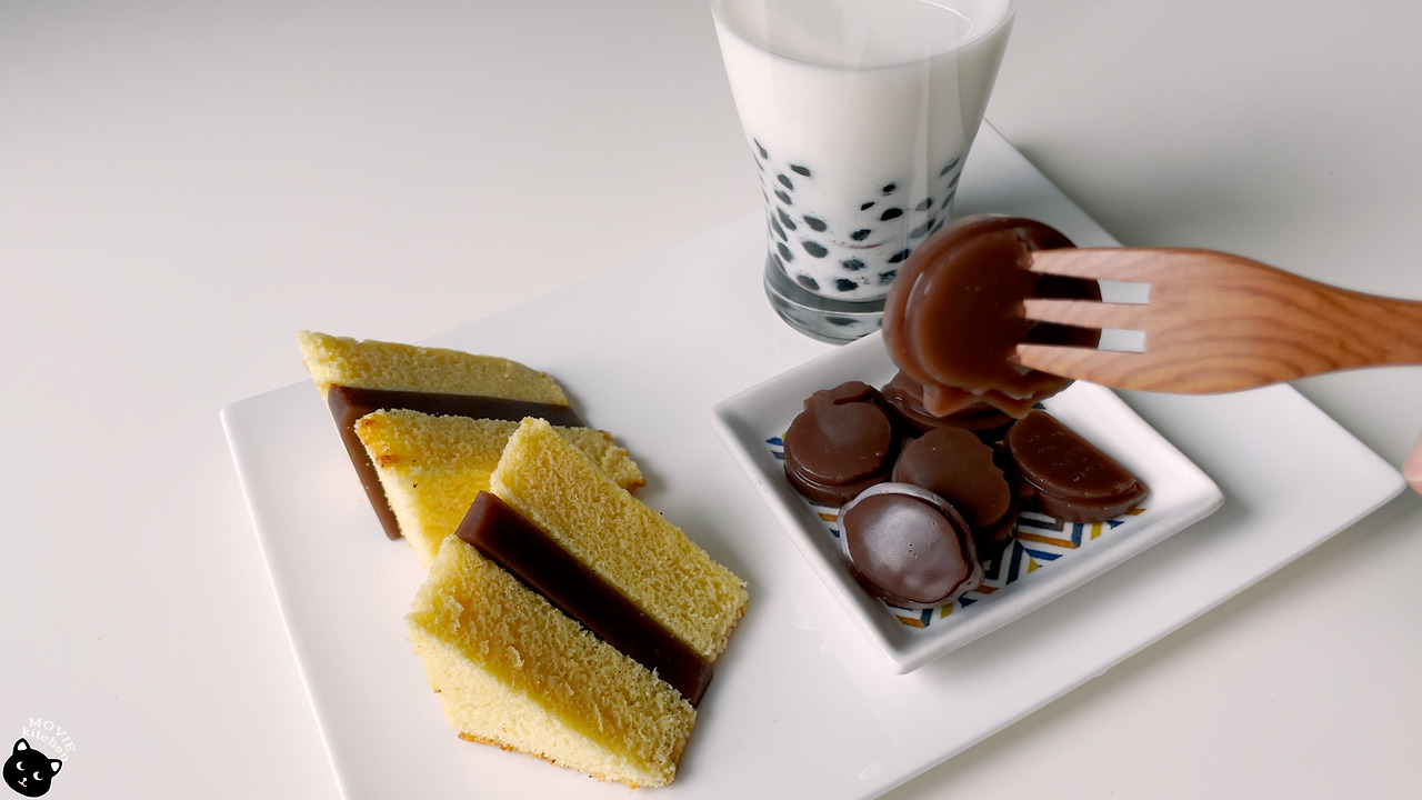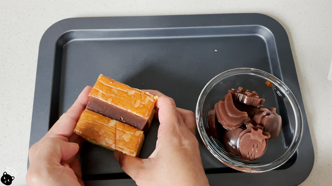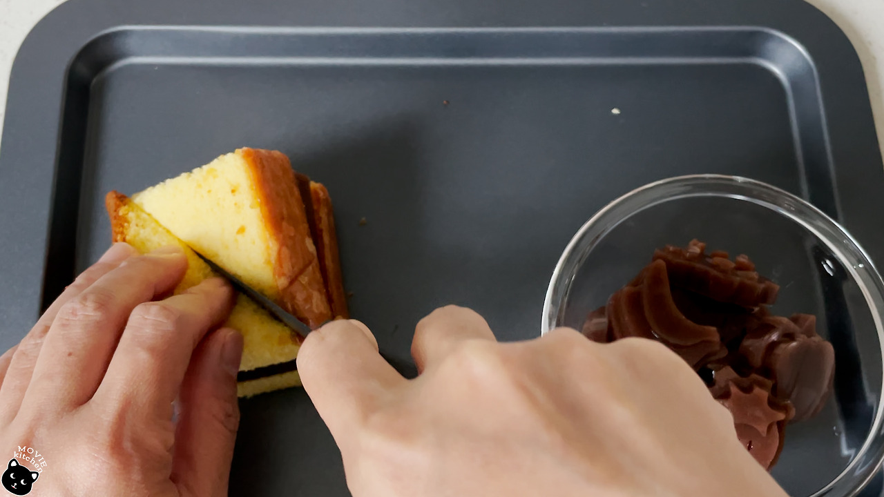 - 준비한 카스텔라 크기에 맞게 양갱을 잘라주고 양갱을 카스텔라 사이에 넣어준다.