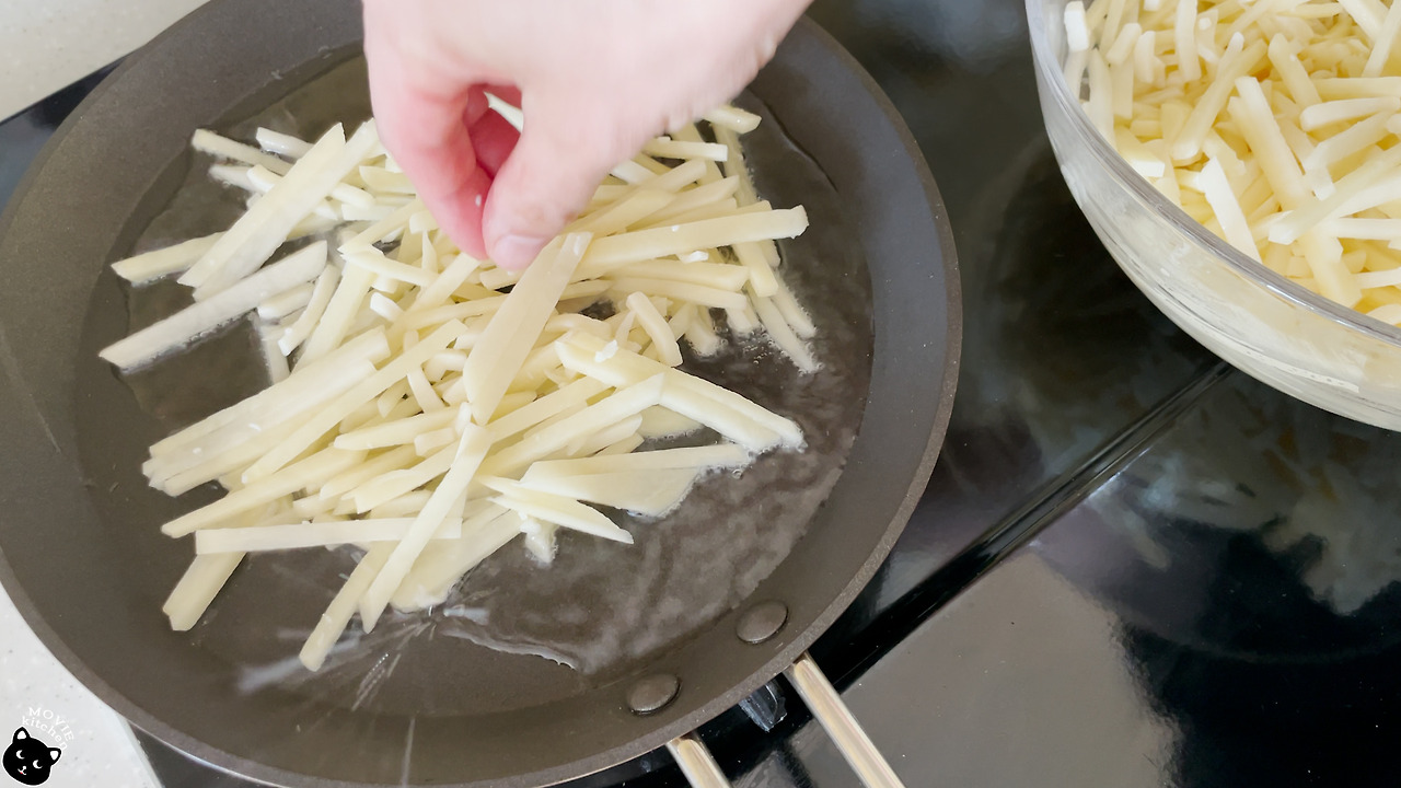 (중간 사이즈) 감자 3개, 슈레드 모차렐라 치즈 60g, 소금, 후추, 식용유