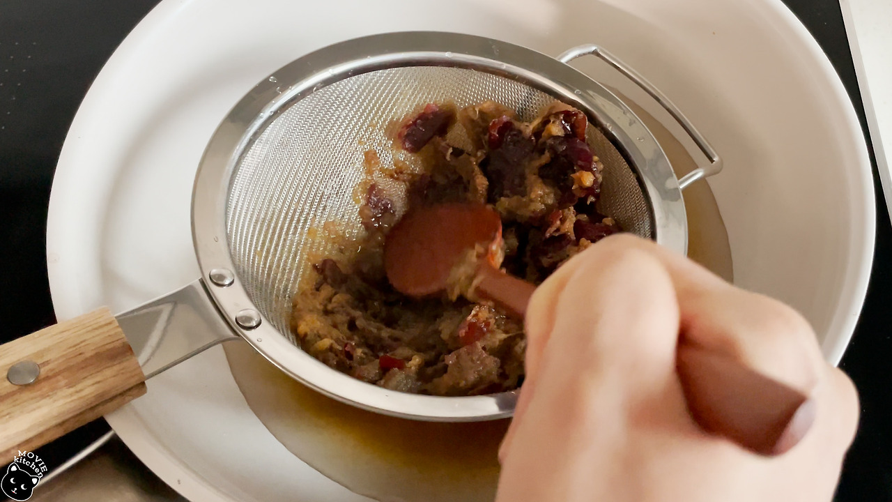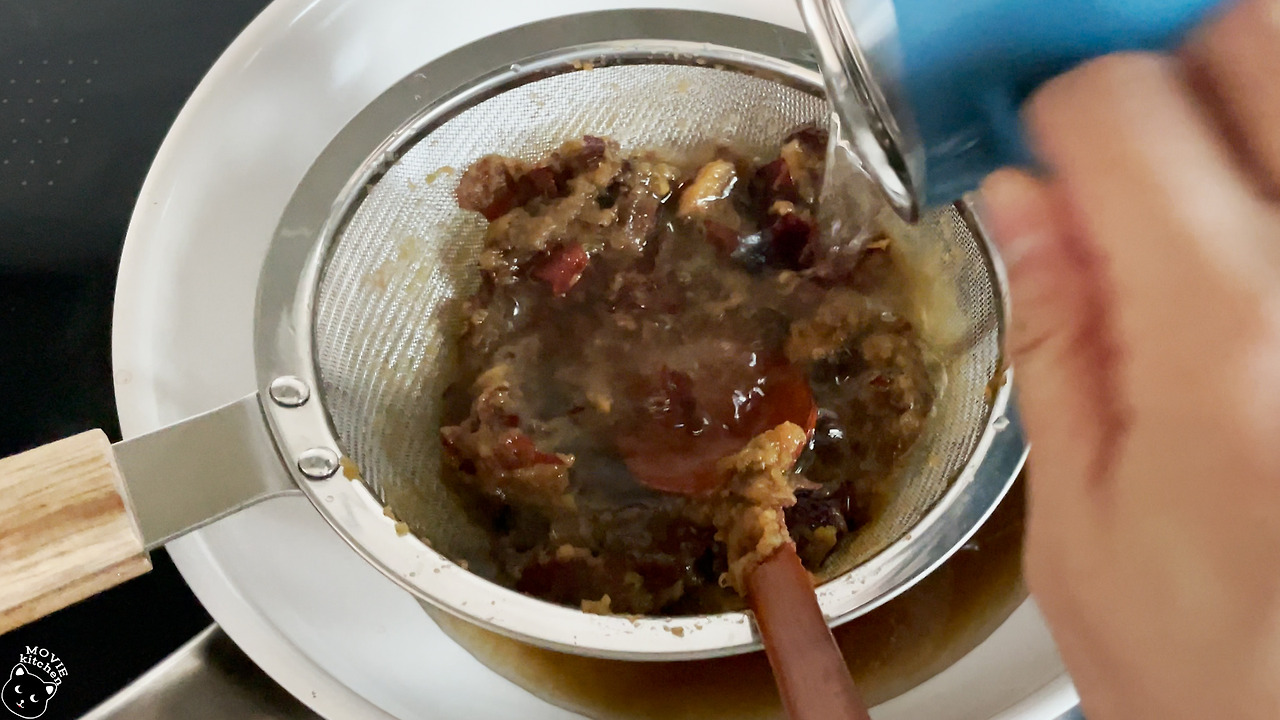 - 불을 끄고 건져낸 대추를 체에 밭쳐 으깬다. 과육이 잘 내려가도록 물을 부어가며 으깨주고 대추차의 맛을 보면서 물의 양은 조절해준다. (걸러진 대추 껍질과 씨는 버린다.)