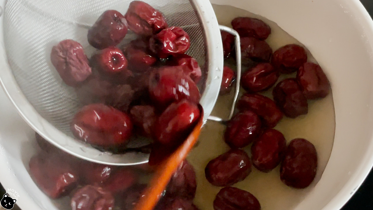 - 깨끗이 세척한 건대추를 냄비에 넣고 대추가 잠길만큼 물을 부어 센 불에서 끓인다.