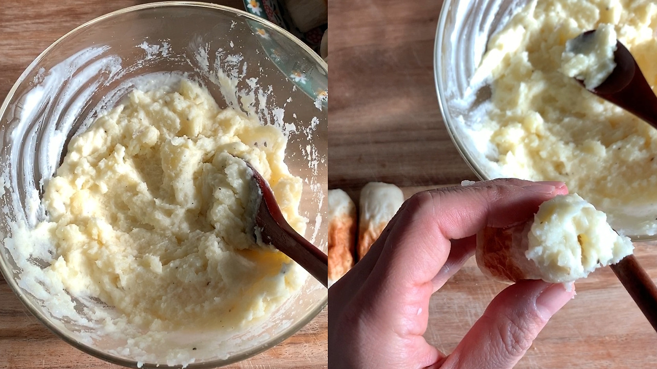 3) 치쿠와에 감자 샐러드를 넣는다. (넣기가 매우 힘들기 때문에 짤주머니 같은걸 사용하면 좋다.)