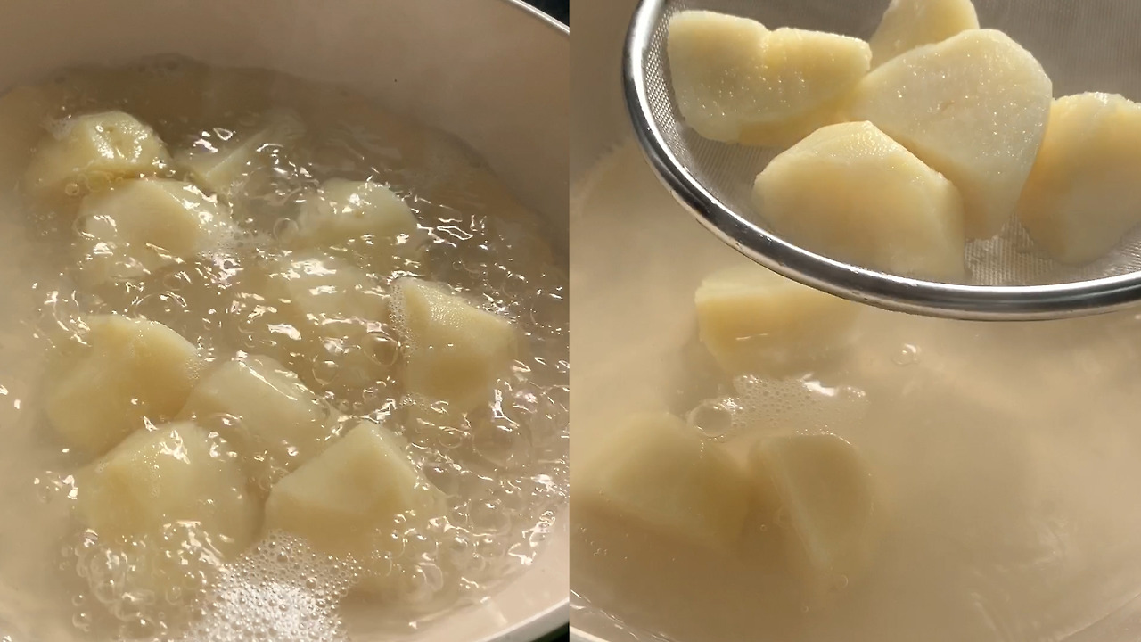 1) 감자를 적당한 크기로 썰고 약 15분간 삶아준다.