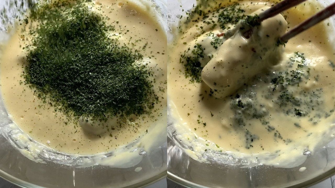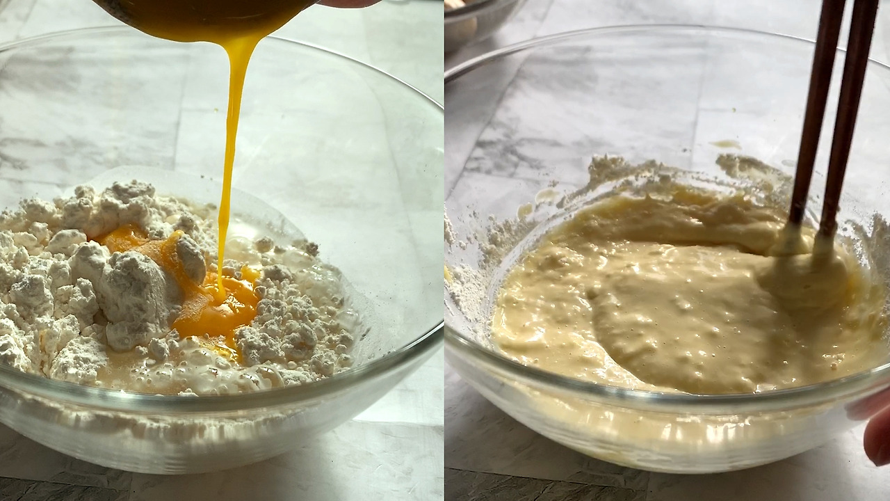 4) 튀김가루, 중력분, 얼음물, 계란 노른자, 파래 가루를 넣고 젓가락으로 살살 섞어준다.