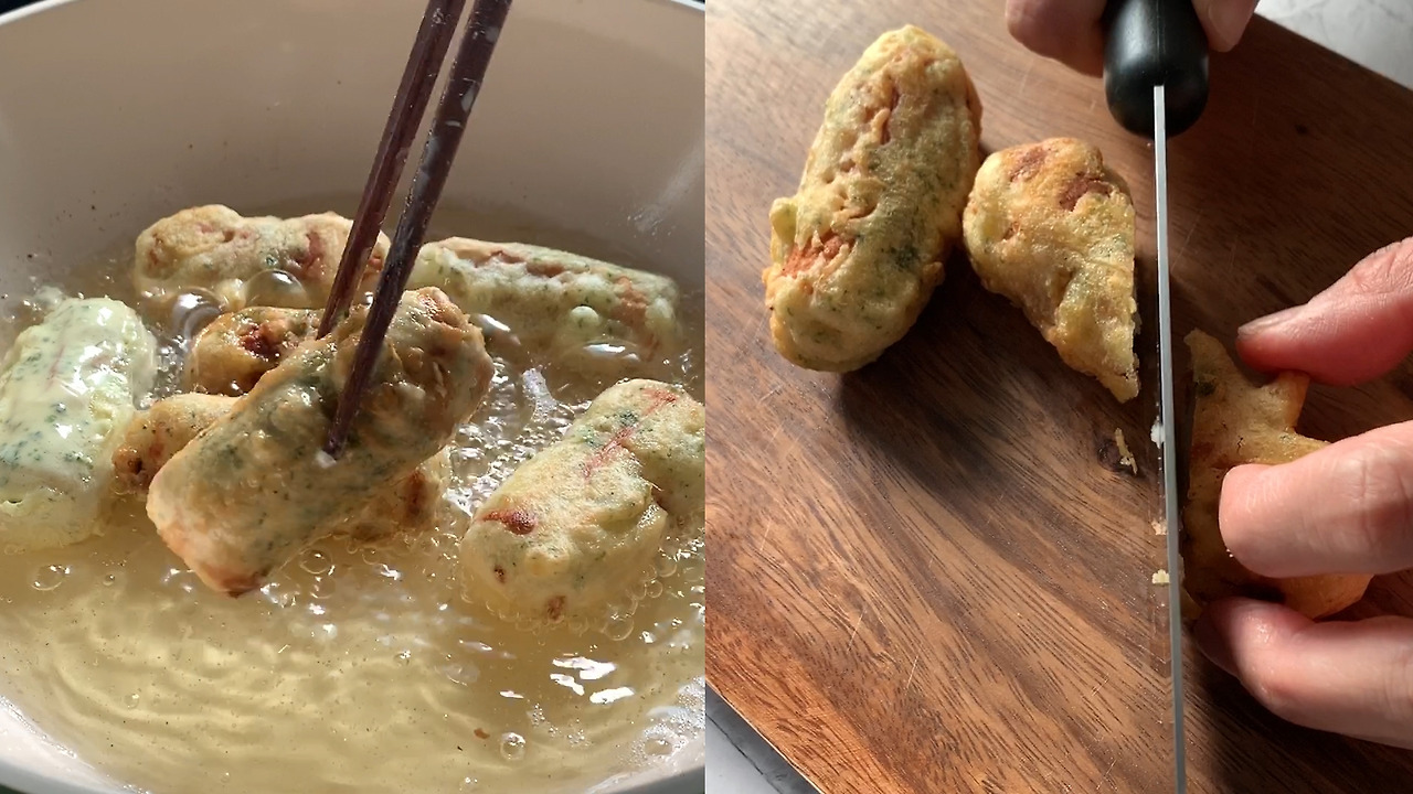 5) 감자 샐러드를 넣은 치쿠와에 밀가루, 반죽 순으로 묻히고 튀긴다.