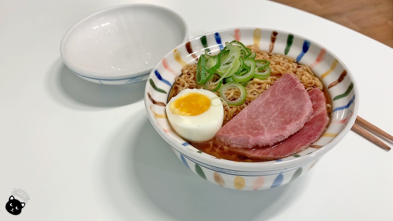 오늘은 <벼랑 위의 포뇨> 속 음식 "스프 없는 마법의 라면"을 가지고 왔다. 왜 마법의 라면인가 하면 그냥 라면 면만 넣고 뜨거운 물을 부었을 뿐인데 뚜껑을 여니 라면 위에 이쁘고 가지런하게 포뇨의 최애 음식 햄과 삶은 달걀, 대파가 올려져 있었기 때문.