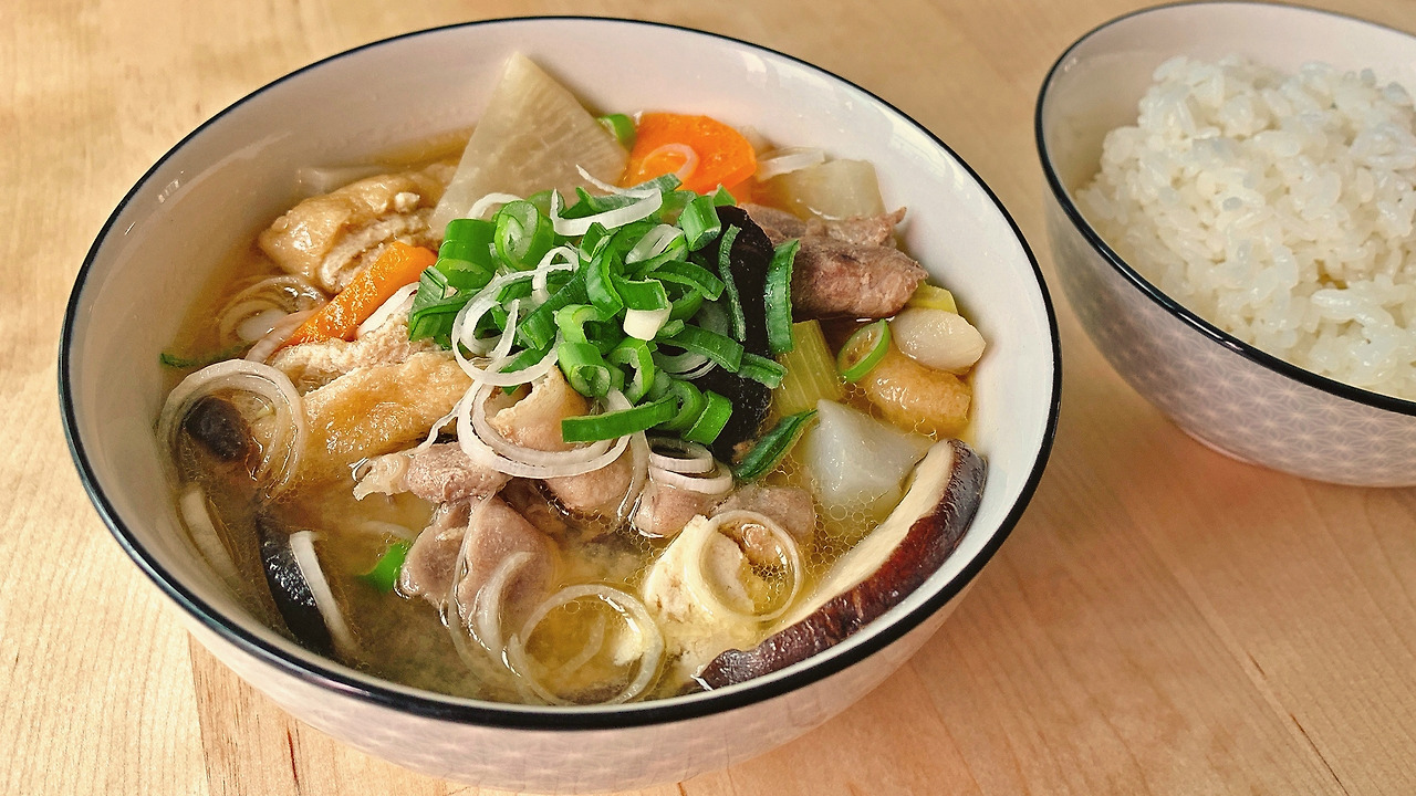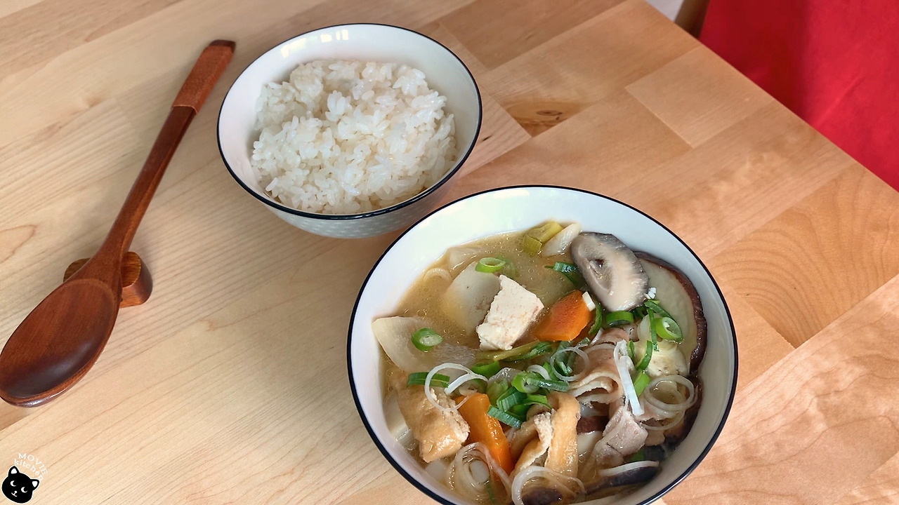 적당한 식감의 채소들과 삼겹살의 감칠맛이 푹 배어 있는 돼지고기 미소국 "돈지루"