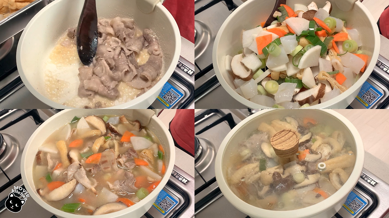 재료 : 대패 삼겹살, 무, 우엉, 당근, 표고버섯, 대파, 두부, 곤약, 유부, 참기름, 간장, 미소