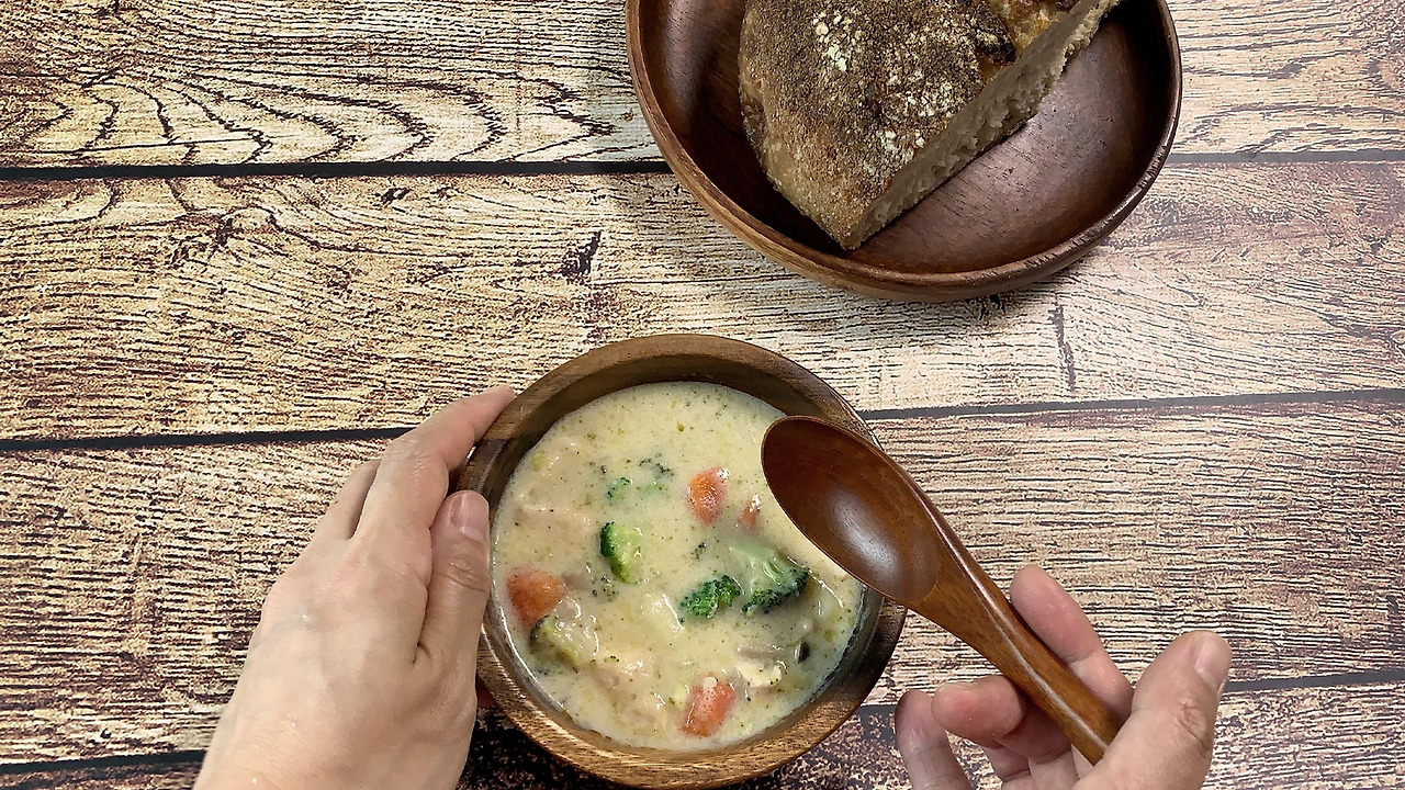 마루 밑 아리에티 속 스튜 먹는 장면을 최대한 따라 해 보고 싶어서 비슷한 그릇과 빵을 준비해봤는데 애니메이션 속에 들어와 있는 느낌이 나는 게 꽤나 기분이 괜찮다. 크림 스튜의 맛도 아주 좋았는데 푹 끓인 채소의 감칠맛과 크림소스의 풍미가 너무 좋고 식사 빵과 잘 어울렸다. 나는 루를 만들 때 좀 더 볶아서 브라운 색이 돌게 했는데 더 하얀색의 소스를 원하면 볶는 시간을 좀 줄이면 된다.