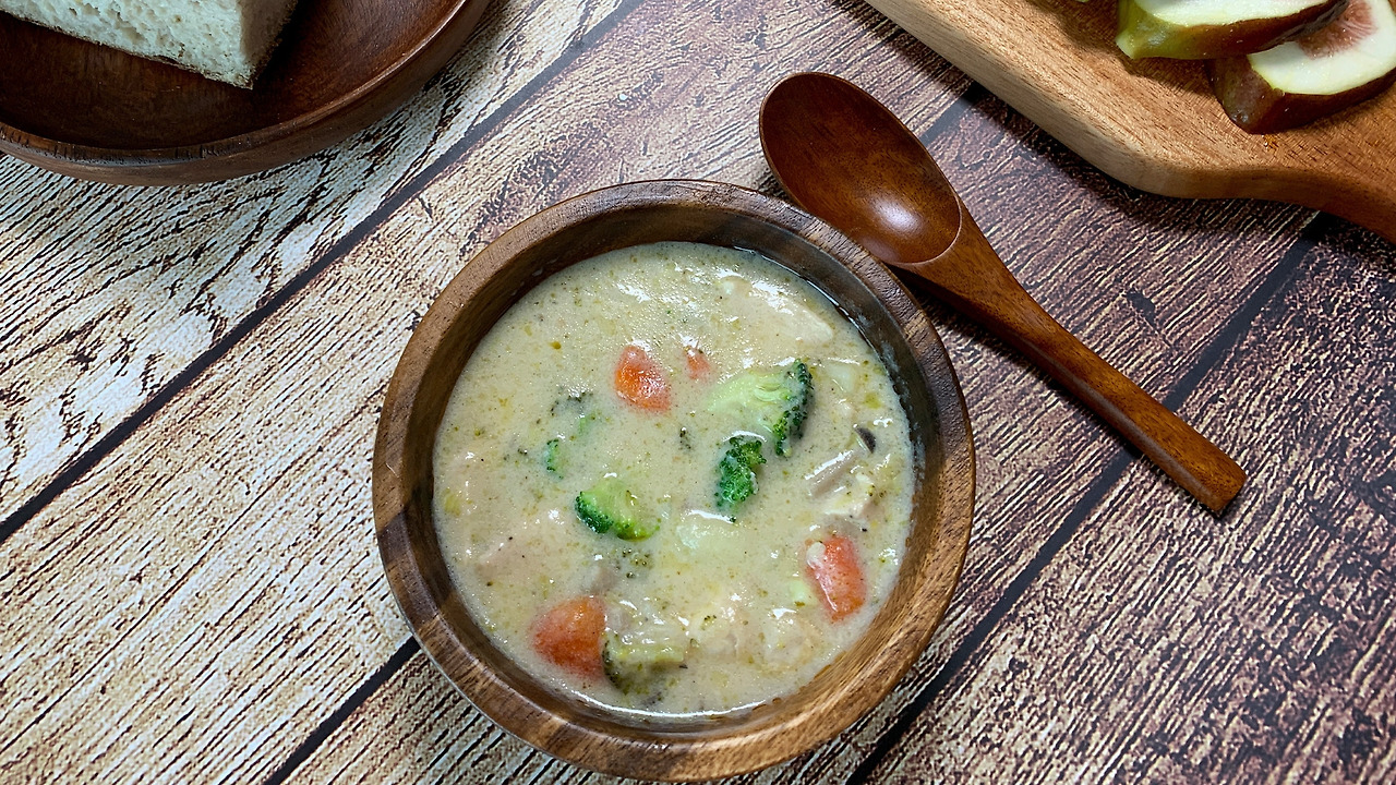- 냄비에 올리브유를 두르고 당근, 감자, 양파, 브로콜리 순으로 볶는다.