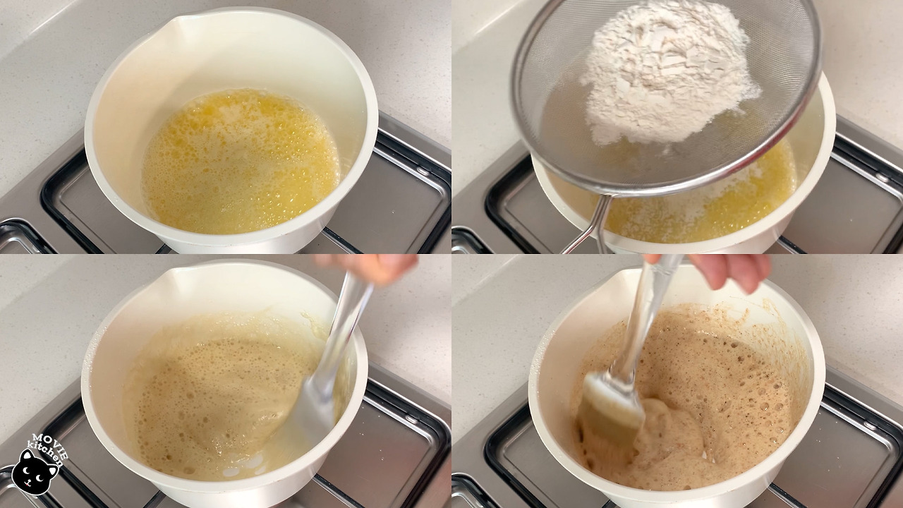 - 버터가 녹으면 밀가루를 체에 넣고 치면서 넣어준다.