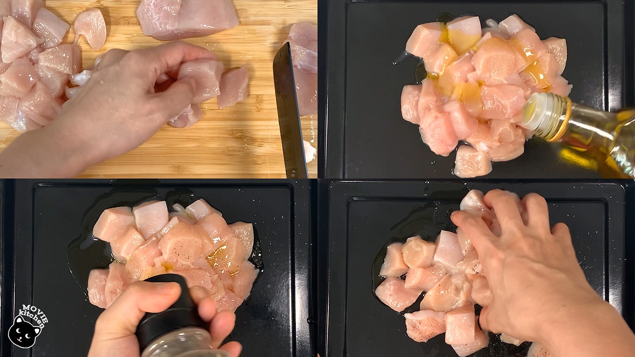 - 한입 크기로 썬 닭가슴살은 올리브유, 소금, 후추로 밑간 해준다.