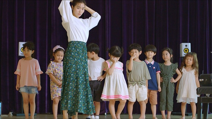 만약, 언어 학습의 효과가 없다면, ‘지은’은 사혈 침으로 아이들의 목 뒤에 눈에 보이지 않게 자상한다. 상흔이 보이지 않으므로 학부모들은 그녀의 사혈 침 사용을 알 수 없고, 아이들은 그녀의 손에 묻은 피를 확인하지만, 이미 그녀의 시스템 안에 묶여 있으므로 어떤 저항도 하지 못한다. 감독은 이처럼 어떤 힘에 길드는 관계의 서늘함을 후반부 강당 장면에서 표현한다. 강당에서 ‘지은’은 아이들을 데리고 춤 수업을 진행하는데, 일반적으로 해당 나이대가 듣는 노래가 아닌 셀럽파이브의 ‘셔터’에 맞춰 수업을 실시한다. 그녀의 춤은 점점 기이해지지만, 아이들은 강당 아래로 내려가지 않을 뿐만 아니라 민감한 반응을 보이지 않는다. 그녀의 괴상한 춤과 아이들의 침착한 반응이 한 프레임 안에 충돌하며 <송곳니>가 그려냈던 광기를 재현한다. 끝으로 <보육교사>는 어린이집에서 귀가한 한 아이가 침대에 누워 있는 동생을 빤히 쳐다보는 장면을 보여준다. 이 장면 속 섬뜩한 이미지는 ‘지은’의 왜곡된 판단과 믿음에서 시작한 서늘함과 공포감을 관객이 끝까지 체험하도록 만든다.