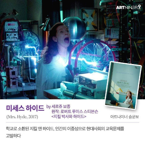 세르쥬 보종 감독이 연출한 <미세스 하이드>는 로버트 루이스 스티븐스 작가의 '지킬 박사와 하이드'를 모티프로 삼고 있으며, 원작의 어둡고 무거운 분위기가 아닌 하늘색 계열의 파스텔톤 분위기를 가지고 있다. <미세스 하이드>는 '미세스 지킬', '말릭', 그리고 '미세스 하이드' 총 세 개 장으로 구성되었고, 독특한 설정을 바탕으로 주제 의식을 그려내는 매력을 가지고 있다. 이 영화에서 남성 캐릭터에서 여성 캐릭터로, 과학자에서 교사로, 그리고 인간의 이중성에서 두 가지 요소의 상호작용으로 바뀐 설정을 확인할 수 있다. 파리의 한 고등학교 기술계열 반에서 물리를 가르치는 교사 미세스 지킬(이자벨 위페르)은 연구실에서 혼자서 실험을 하던 도중 전기 충격으로 인한 몸의 변화 때문에 미세스 하이드가 되는데, 이 캐릭터를 중심으로 프랑스 교육 현장의 문제가 다뤄진다. 그러나, 교육 제도만 다를 뿐이지 <미세스 하이드>를 보면서 프랑스 교육 현장에 한정 짓지 않고 전반적인 학교 사회 문제에 대해 고민해볼 수 있게 된다.