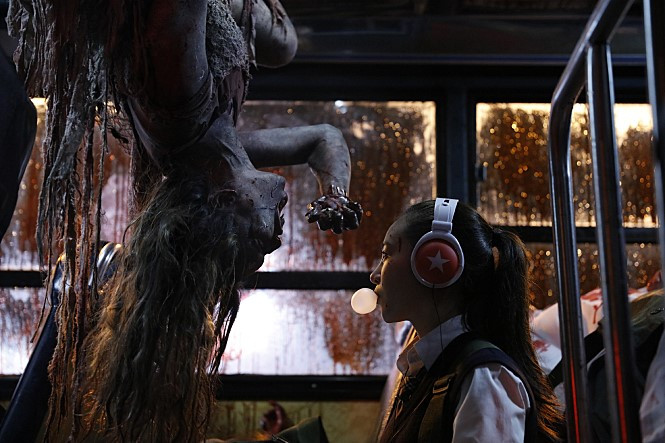 두 번째는 송운화와 가진동이 특별 출연한 장면으로도 알려지기도 한 버스에 탑승 중인 학생들이 집단으로 학살당하는 장면이다. 길 한복판에서 괴물을 만난 학생들은 아무런 대응도 하지 못한 채 죽게 된다. 굉장히 잔인한 장면은 조형적 유사성과 교차 편집을 통해 아주 리드미컬하면서도 세련되게 그려진다. 믹서기로 얼음과 함께 갈리는 수박과 괴물의 손에 의해 무참히 죽임을 당하는 버스 안을 번갈아 가면서 보여주는데, 이런 유사성이 지속되면서 수박 주스 제조가 완성되며 멈춘 믹서기를 통해 그다음 장면이 공개되기 전에 어떤 상황이 벌어질지 예상 가능할 수 있게 돕는다. 그리고 롱 쇼트로 담아낸 길 한복판 위에 심하게 흔들리는 버스 장면은 봉준호 감독의 <괴물> (2006)에서 컨테이너에 갇힌 수십 명의 사람이 피를 흘리며 죽은 장면을 문득 떠오르게 한다.