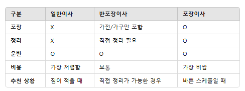 팁: 짐이 많거나 시간이 부족하다면 포장이사를 추천하며, 예산이 부족하면 반포장이사를 선택해 비용을 절약할 수 있습니다.