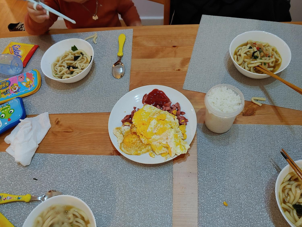 말라가에서의 첫 저녁 식사 메뉴는 달걀과 소시지, 그리고 한국에서부터 들고 온 우동. 그리고 오늘 베를린에서 아침으로 먹고 남은 쌀밥까지. 이번엔 먹을거리는 안 챙기겠다고 노력했지만, 우동을 좋아하는 첫째 녀석 덕에 간편하게 먹을 수 있는 브랜드 우동을 여기까지 들고 왔다. 짐이 많아 하루라도 빨리 털어버리고 싶었다. 맛도 있지만, 홀가분한 기분이다. 저녁 식사 시간이 늦어서 그런지 아이들도 엄청나게 잘 먹는다. 나도 아내도 평소 양보다 많이 먹어 버렸다. 덕분에 차리면서도 이걸 누가 다 먹냐고 농담을 했던 일이 민망하게 되어버렸다.