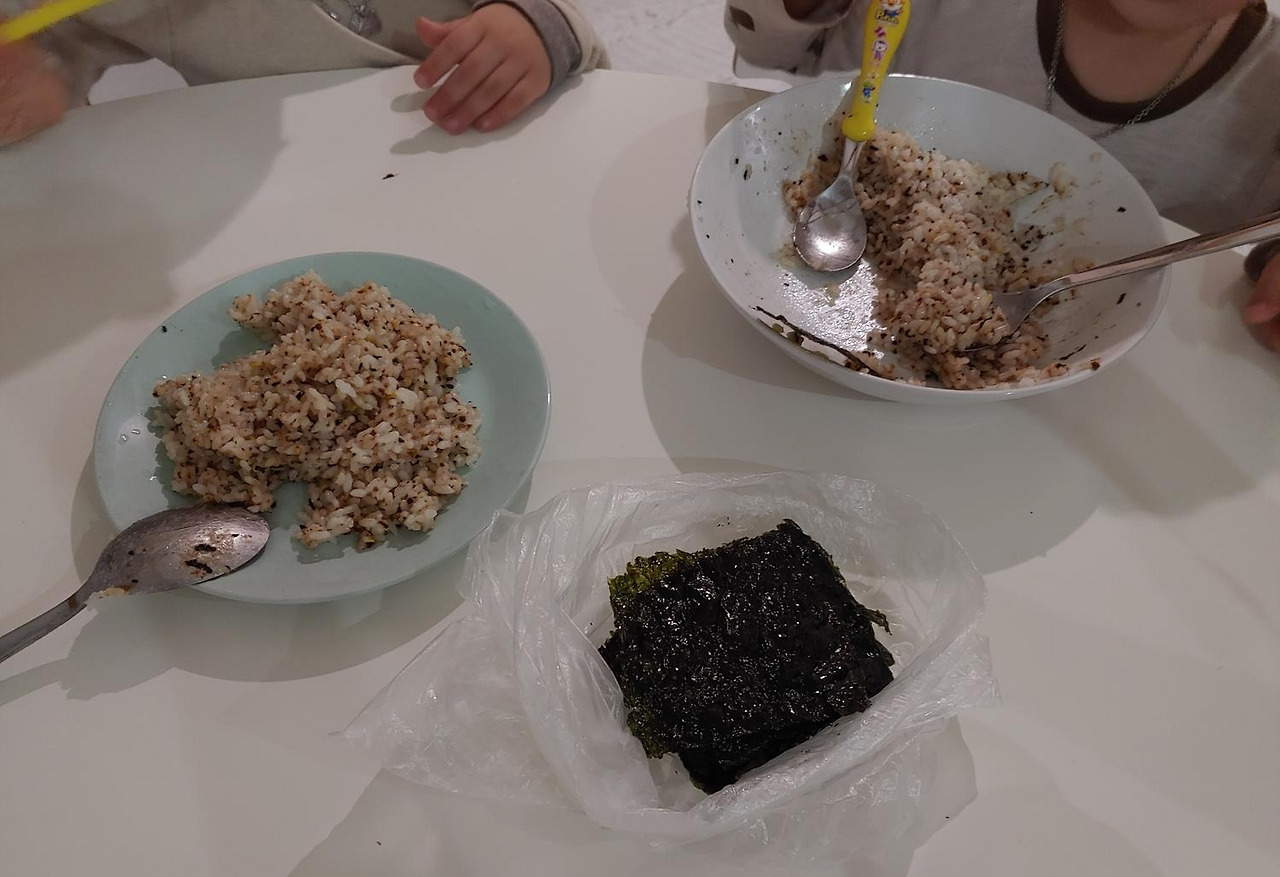 방에 들어오니 밤 9시. 저녁을 먹어야 하나, 아니면 그냥 자야 하나 고민을 하다 간단하게 식사를 하고 자기로 했다. 아이들에겐 미안하지만, 오늘 메뉴는 밥과 김. 뭐, 오늘은 아빠 엄마도 어쩔 수가 없다. 이건 마치 피난을 가며 먹는 식사와 다를 바 없다. 밥을 하고, 식사를 준비하는 사이 나는 숙소 바로 옆에 있는 동네 슈퍼에 들러 물과 달걀을 사 왔다. 물과 계란은 우리 가족에게 가장 기본이 되는 식재료이다. 참 보잘것없는 식사이지만, 배가 고팠던 아이들은 이것도 맛있다며 한껏 먹는다. 덕분에 아빠 엄마는 별로 먹을게 남아 있지 않았다.